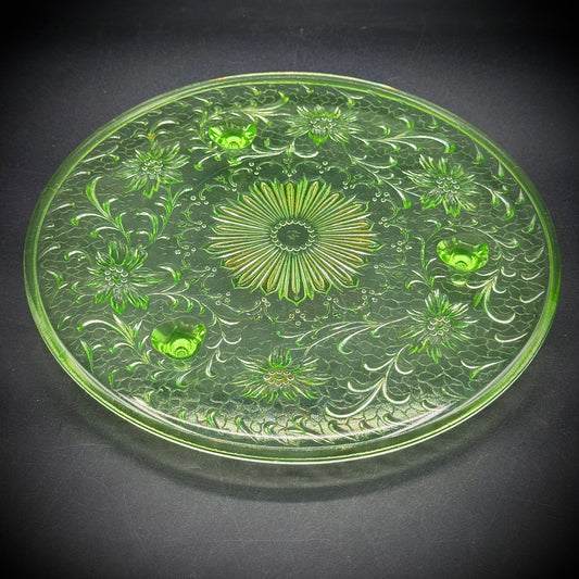 Vintage Round Footed Glowing Uranium Glass Cake Stand