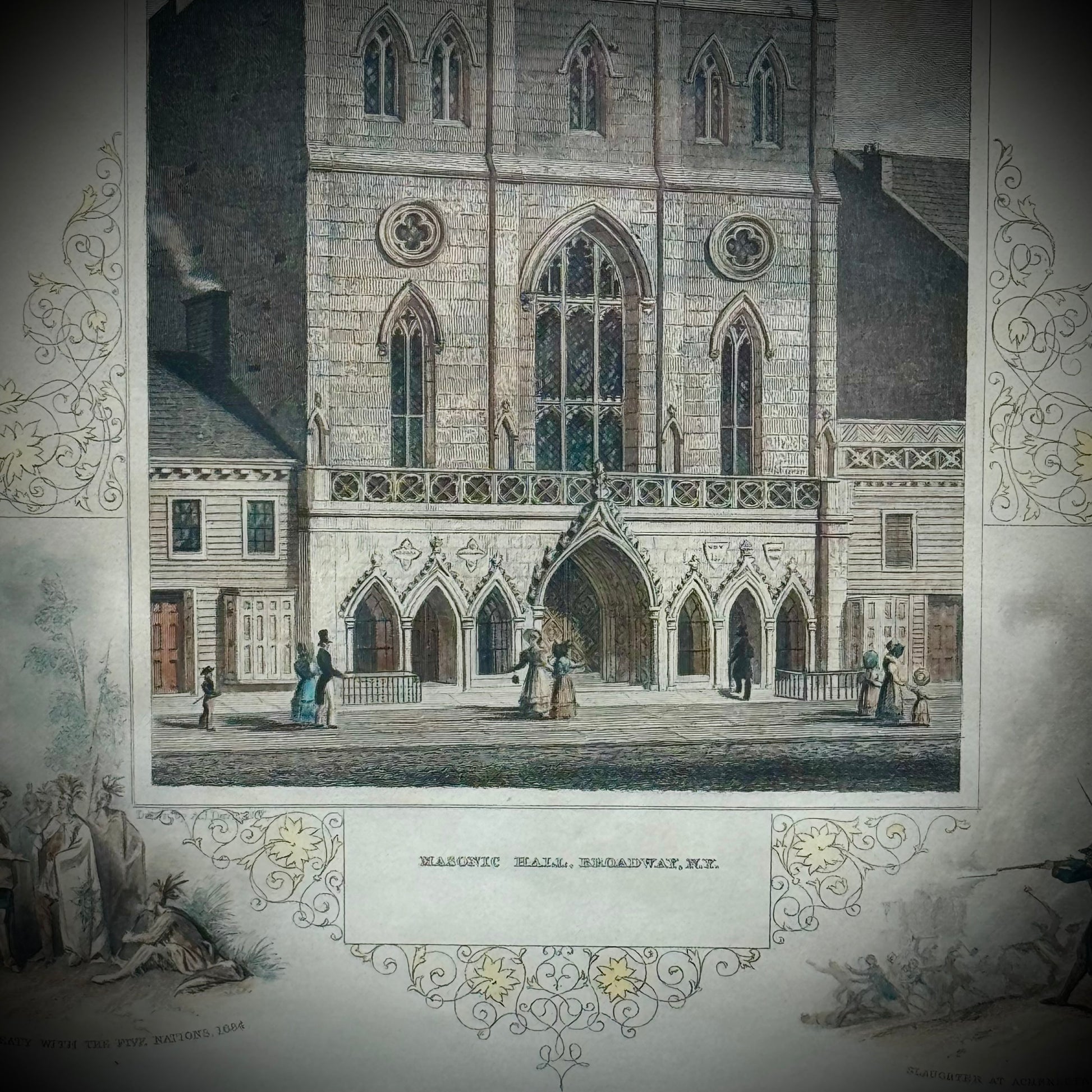 Incredible true antique lithograph depicting the Masonic Hall of New York City in the early 1800s. Original publication date of 1841. Professionally framed and matted. An exquisite look into history.