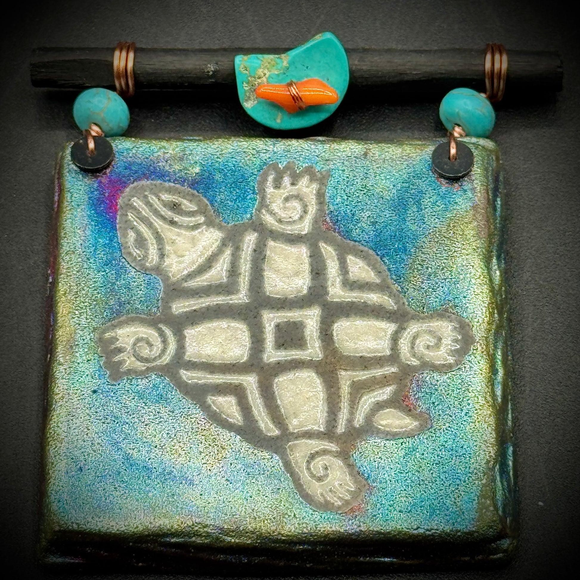 "Art With Heart" Turquoise, Coral and Raku Turtle Art Piece with Poem