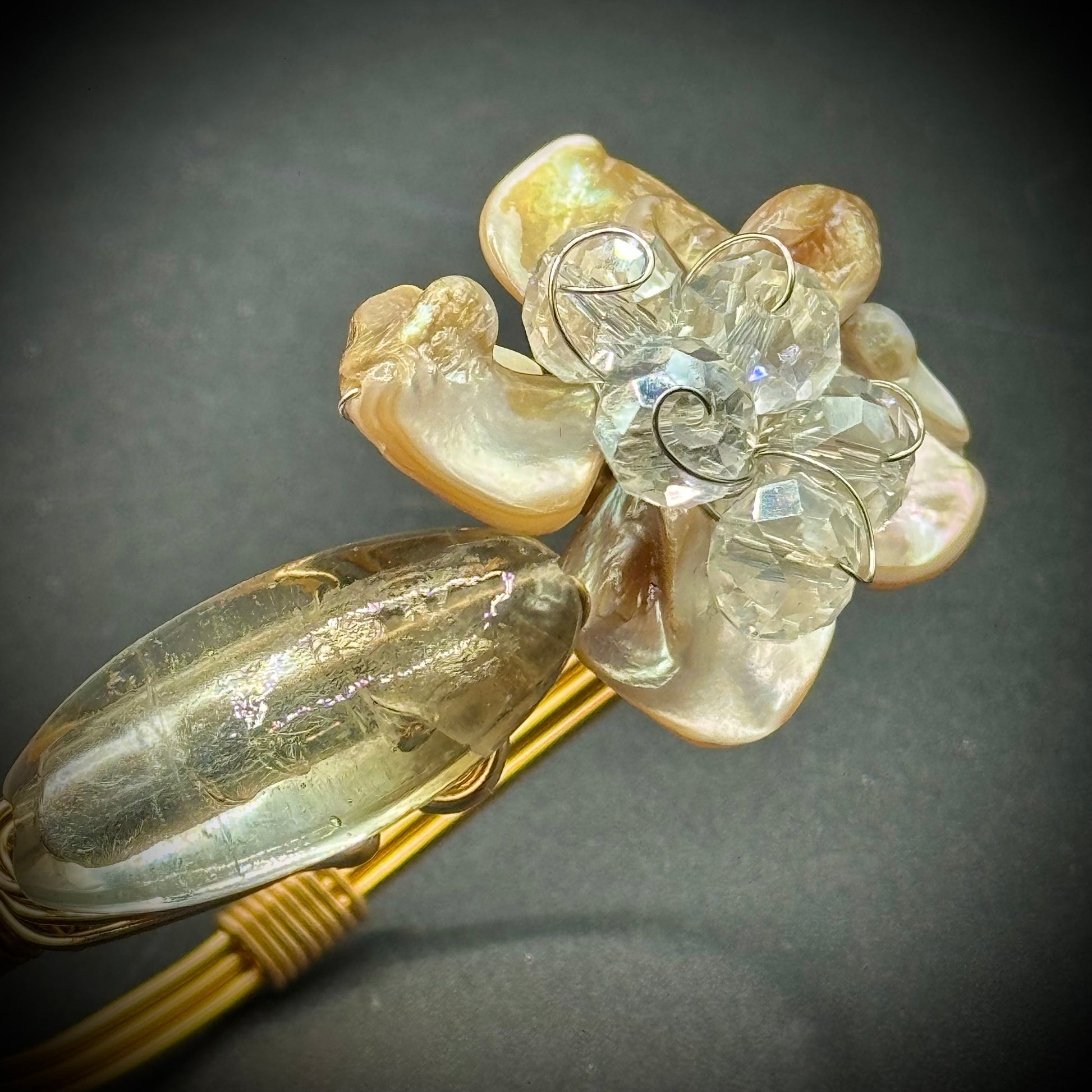 An exquisite bracelet with so many aspects to its design. Adjustable in size and with so much fire in the faceted beads, complimented by the gold tone, shell and stone.