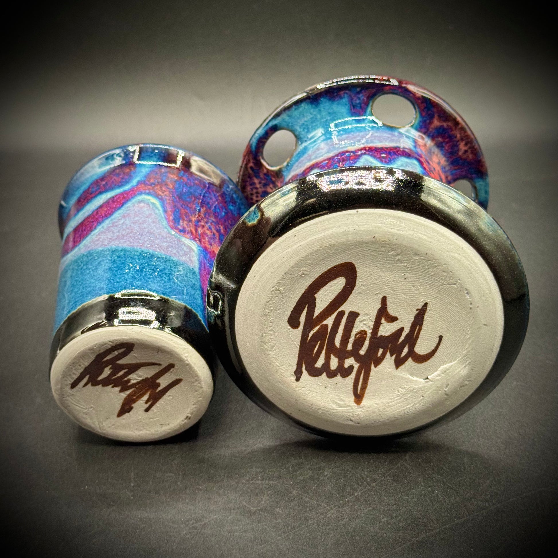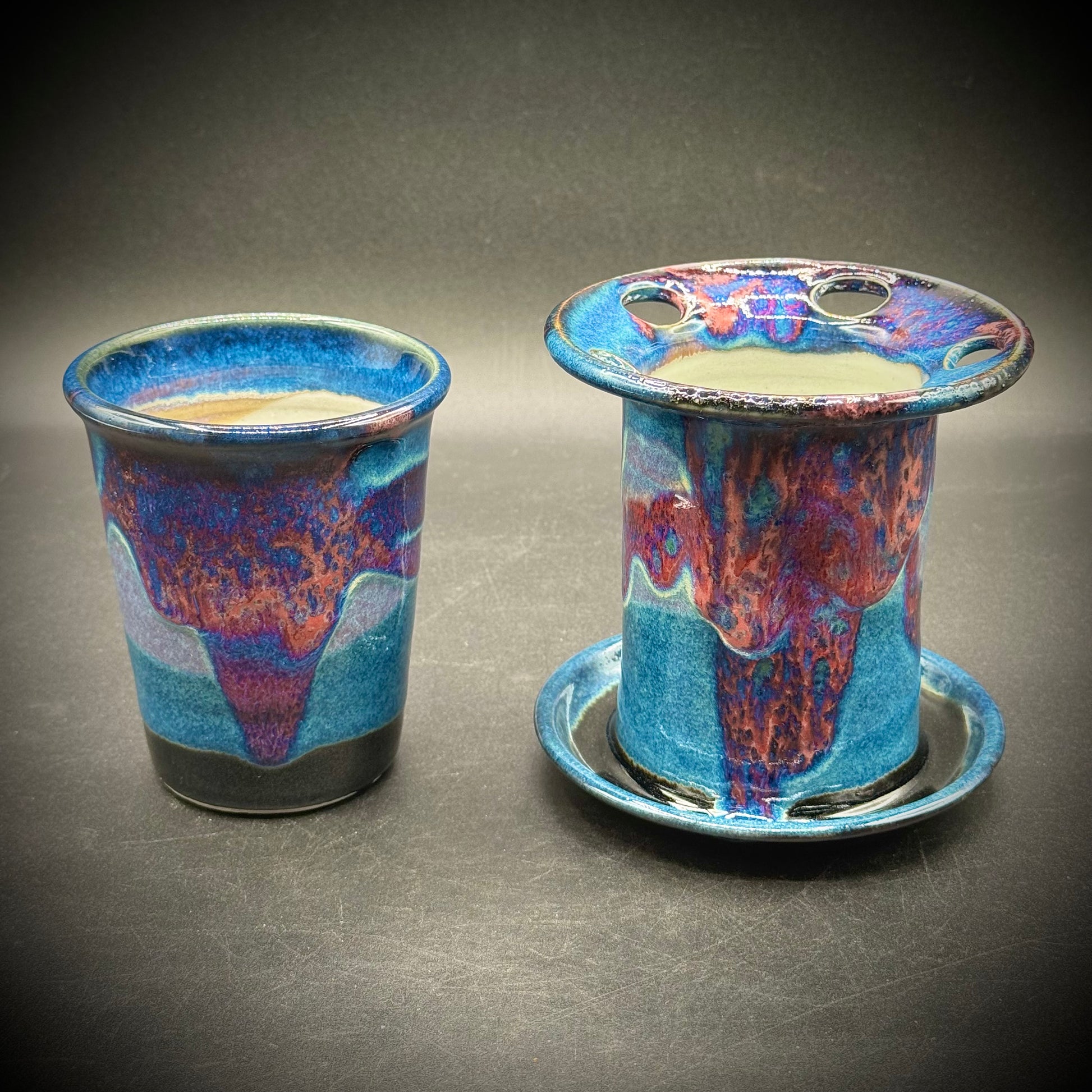 From the studio of Sonoma artist Rick Petteford, these signed drip glaze pottery pieces are both beautiful and utilitarian. The cup measures 4.24" tall while the toothpaste holder is 4.75" tall.