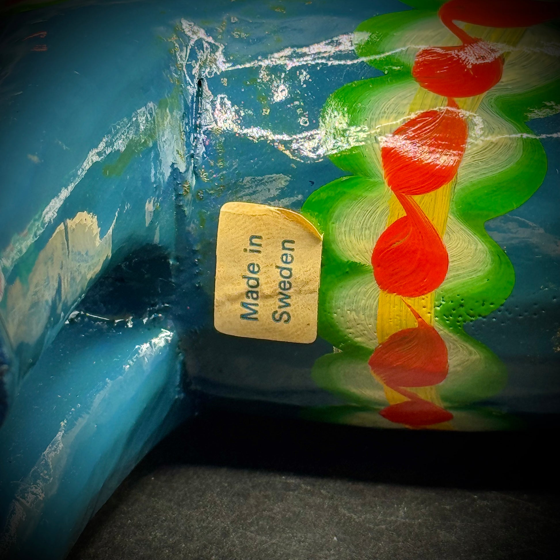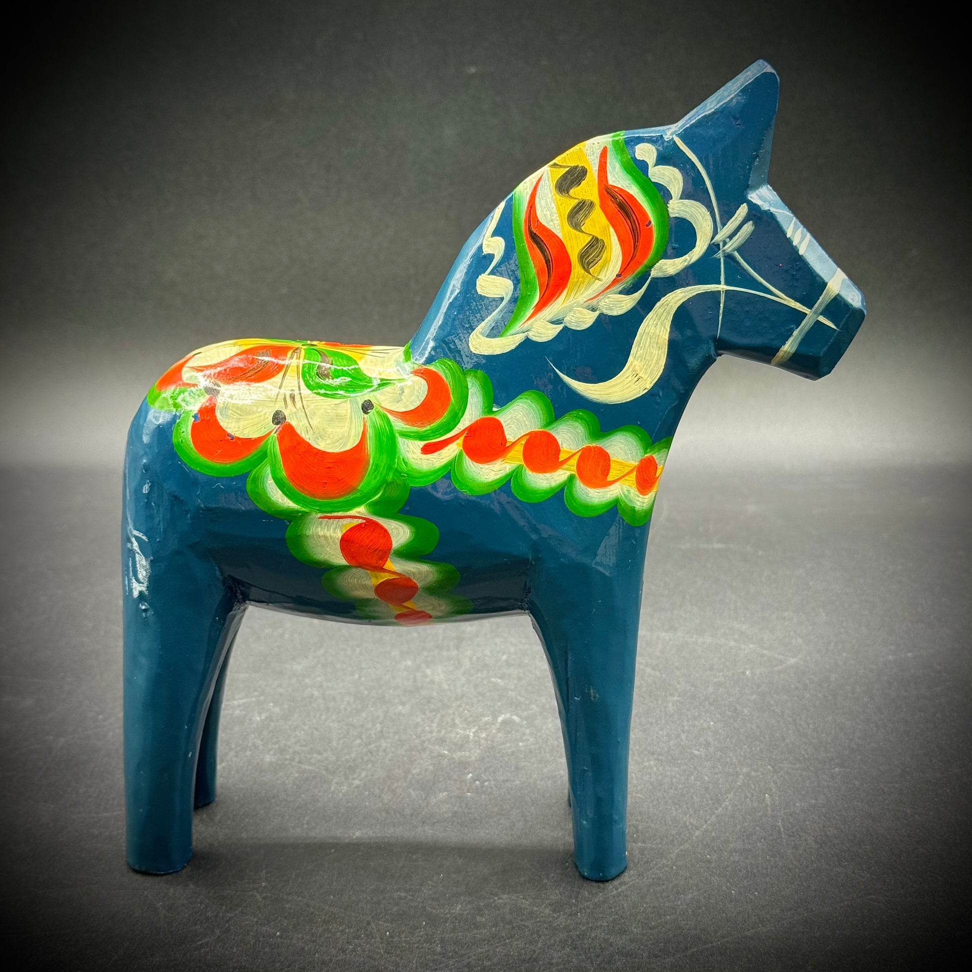 They don't come any better than this one! This is a hand painted wooden Dala Horse with deep blue base color and vibrant designs. Original Swedish label affixed to the bottom.