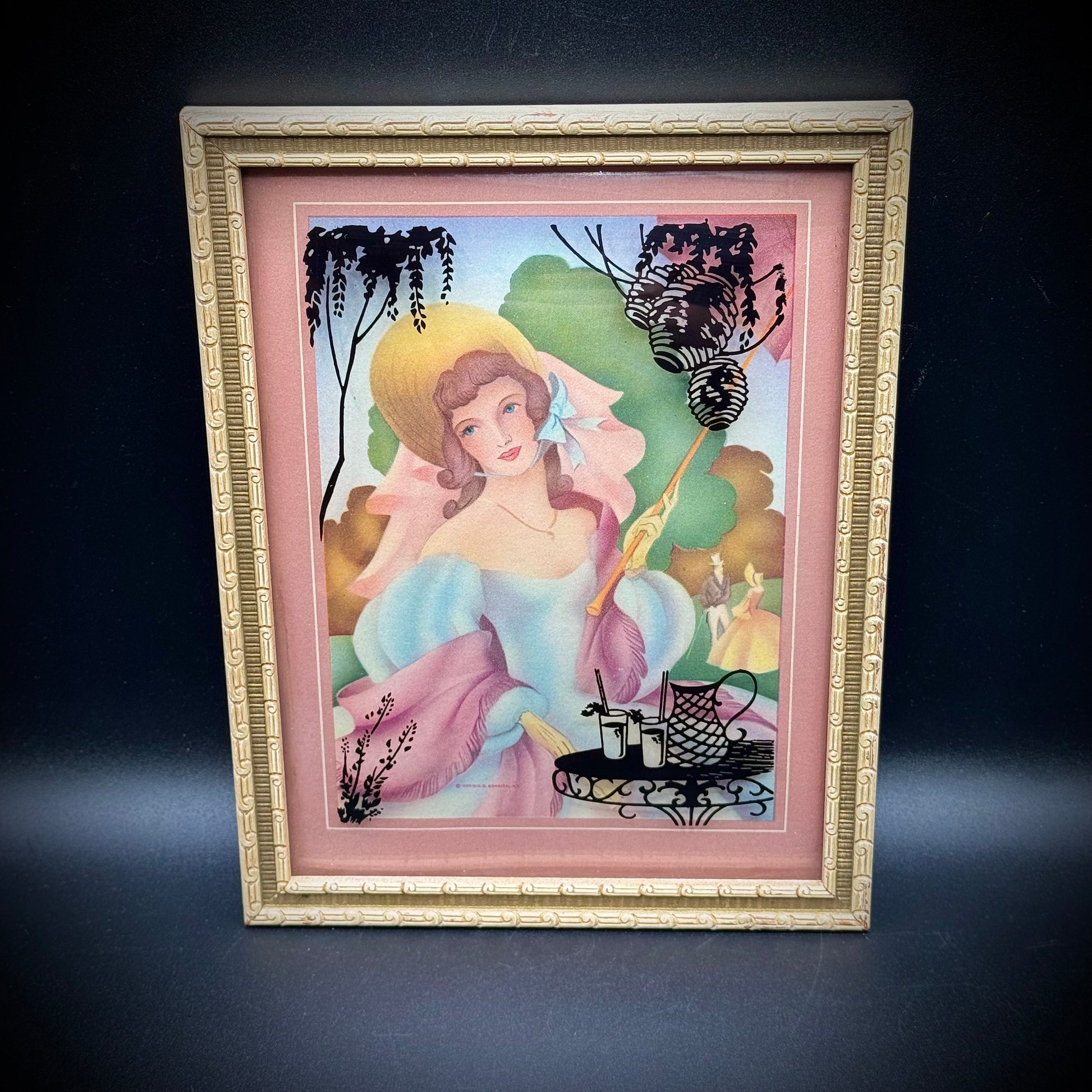 Framed 1930s Convex Glass and Printed Southern Belle Art