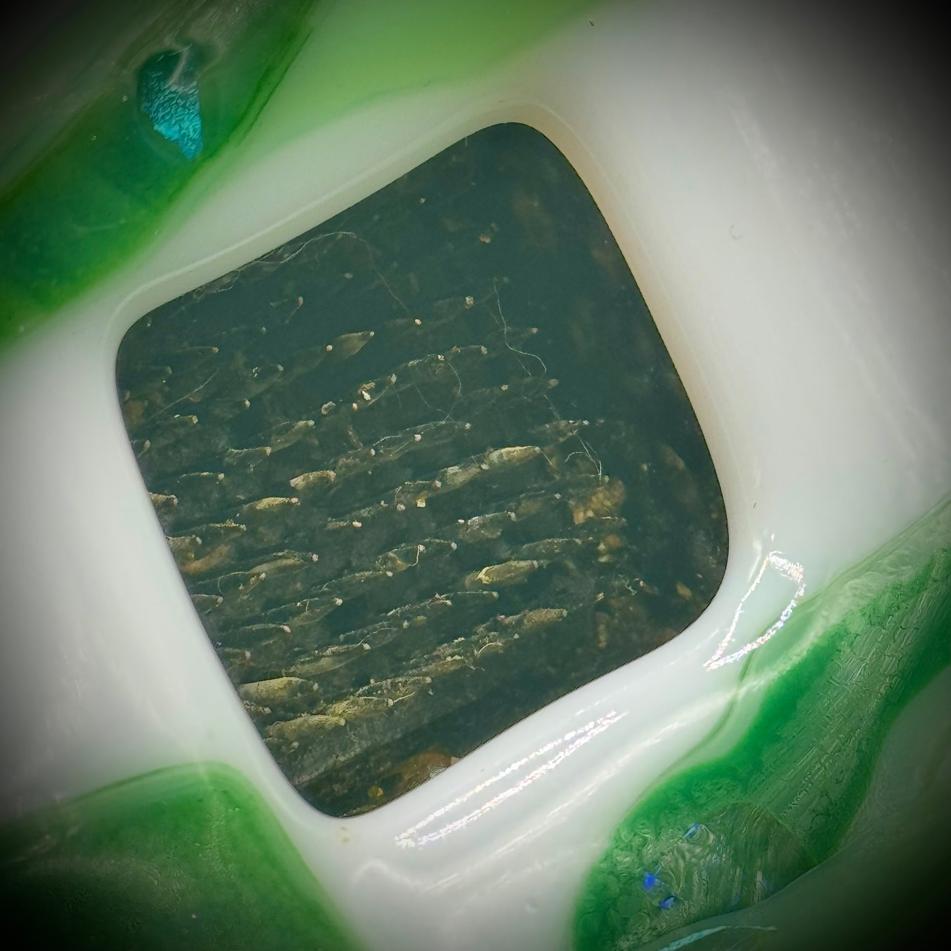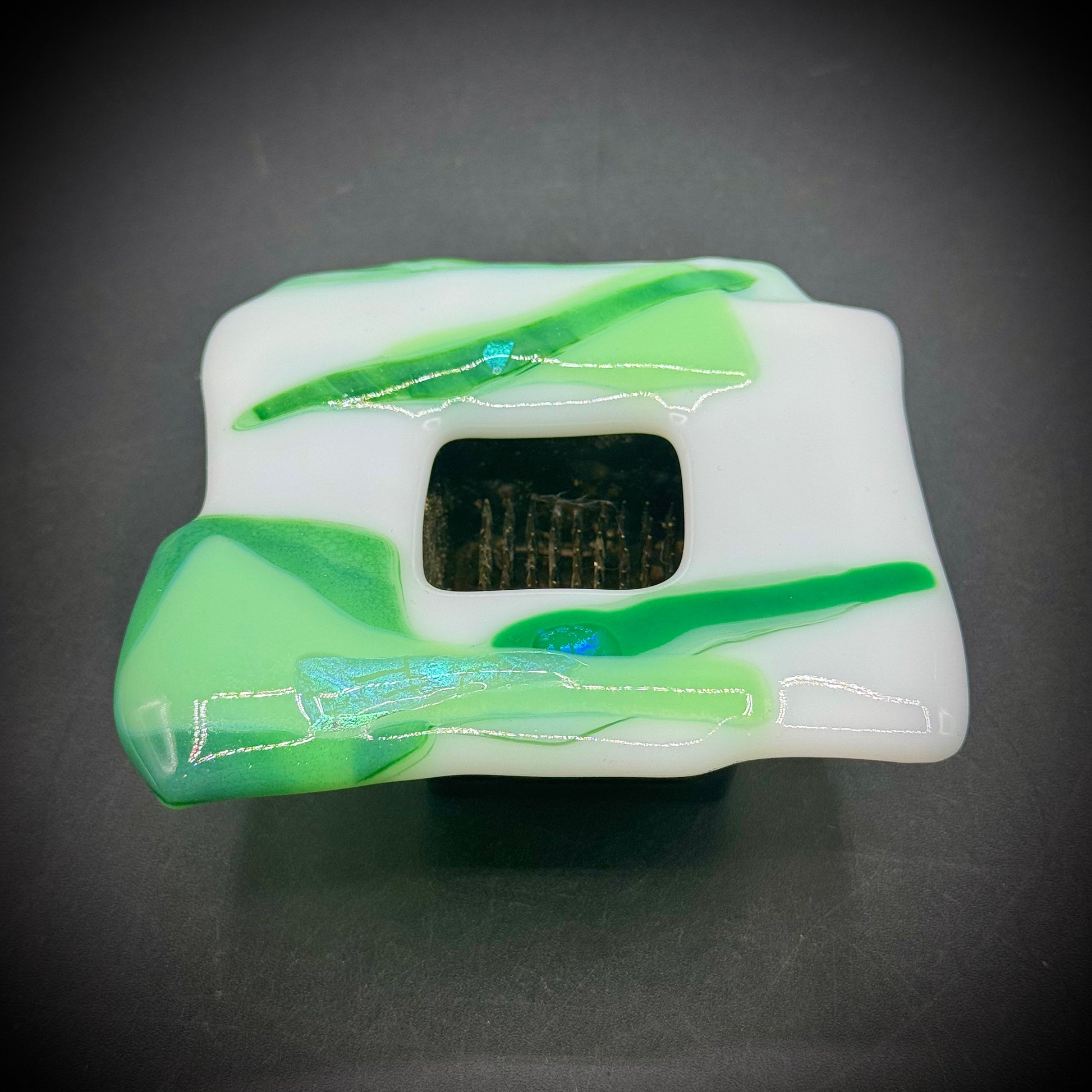 Beautiful green and white fused art glass with luminescent hints in multiple spots. Inside is a traditional Ikebana spiked flower frog that is ready to display plants.