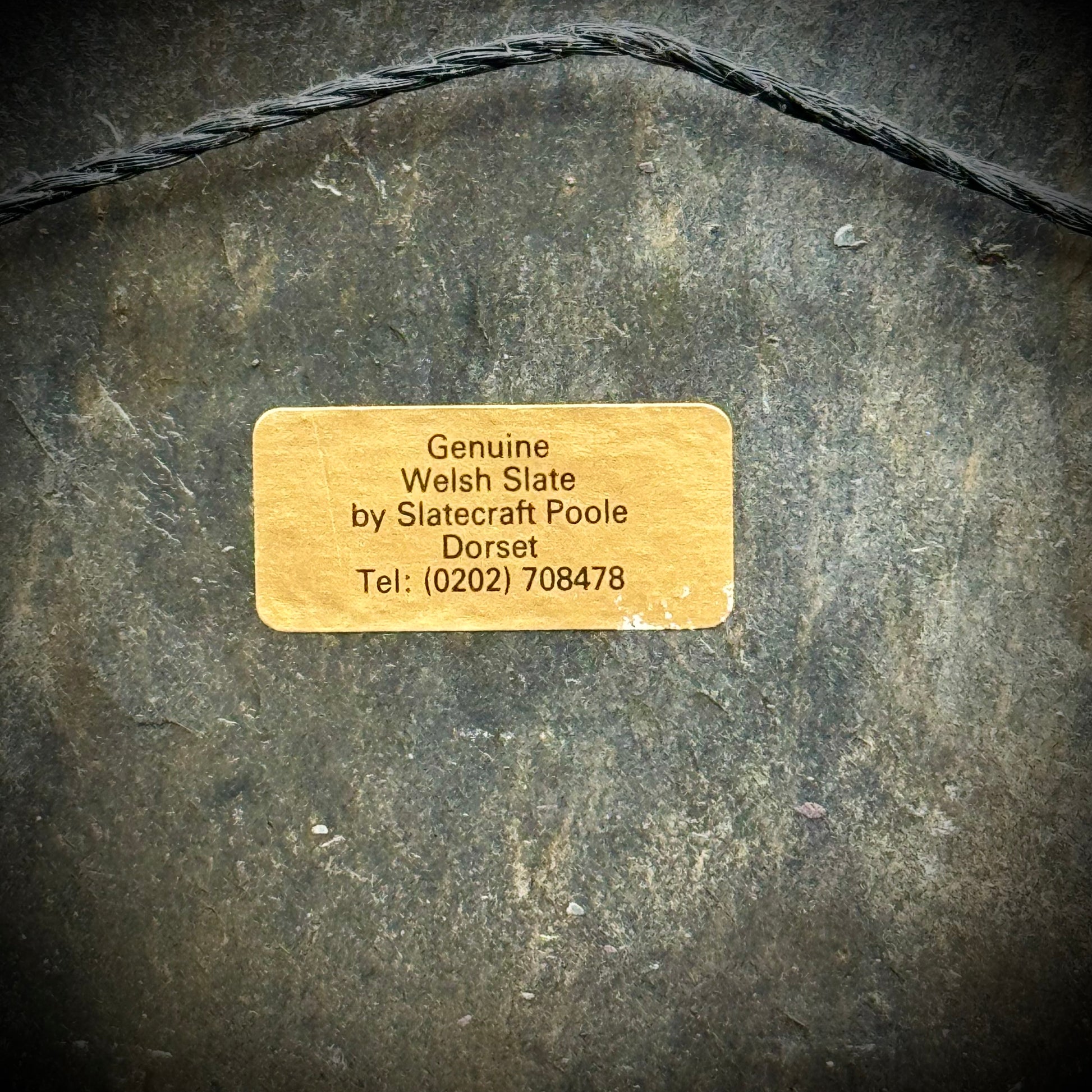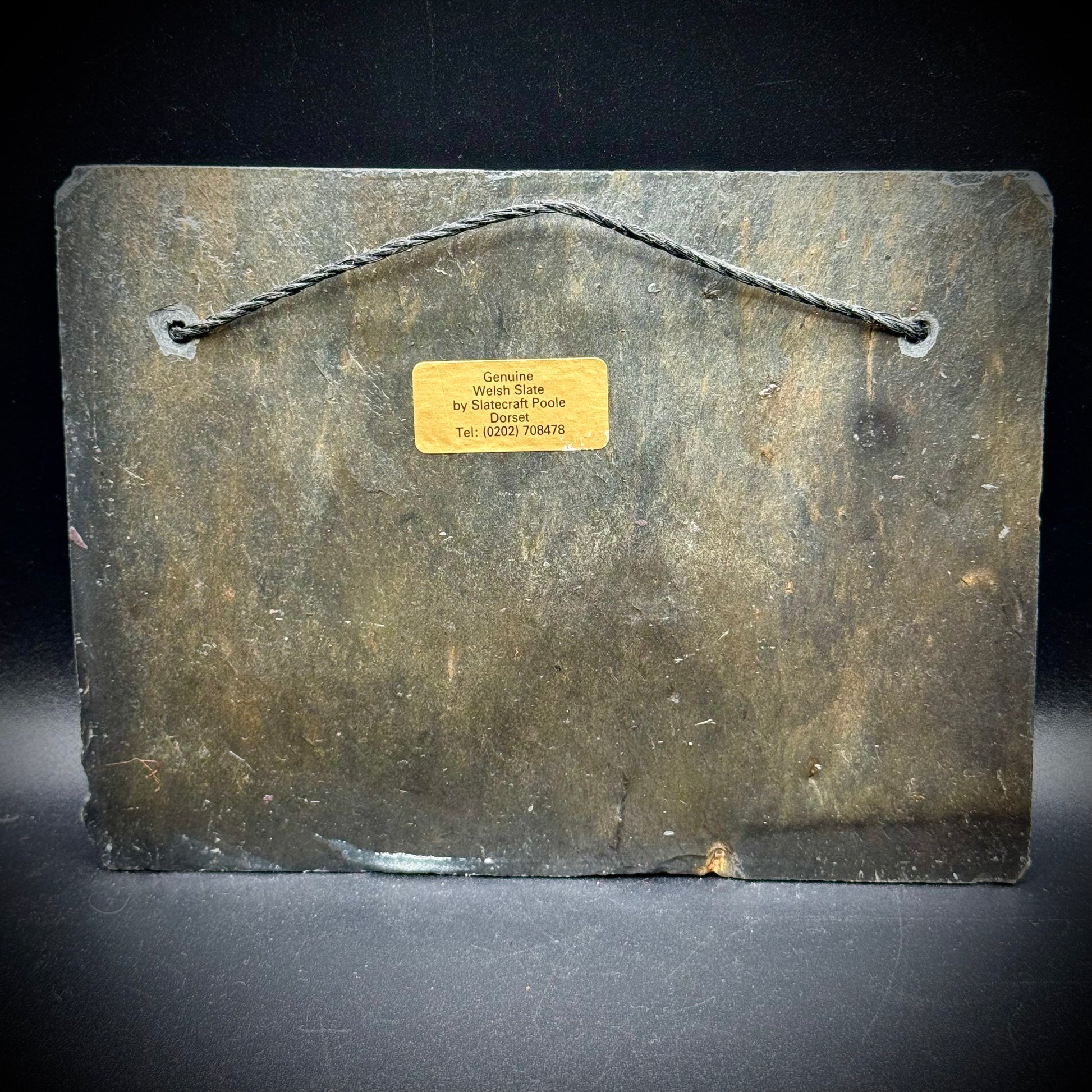 Renaissance ship art affixed to an antique slate tile with original Dorset England label on back.
