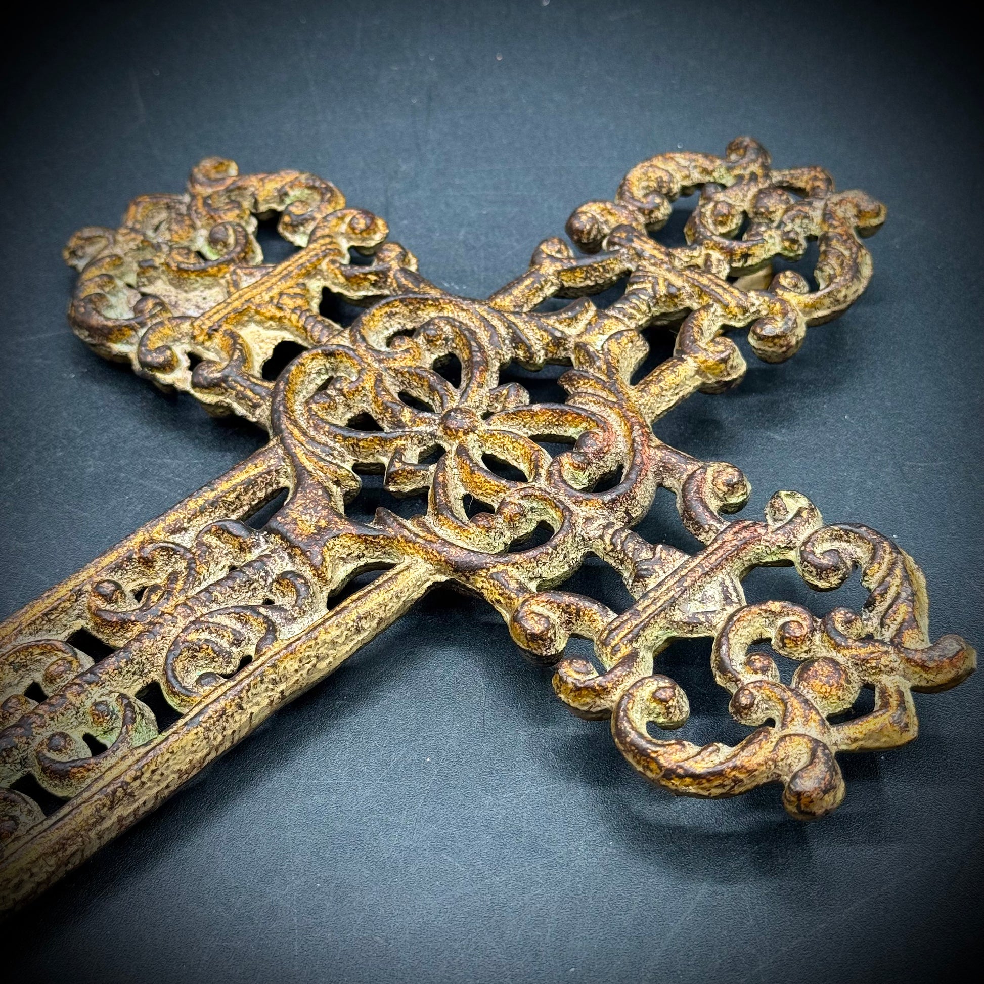 Incredible design and detail in this heavy modern gothic metal cross, measuring 11" by 7.5"