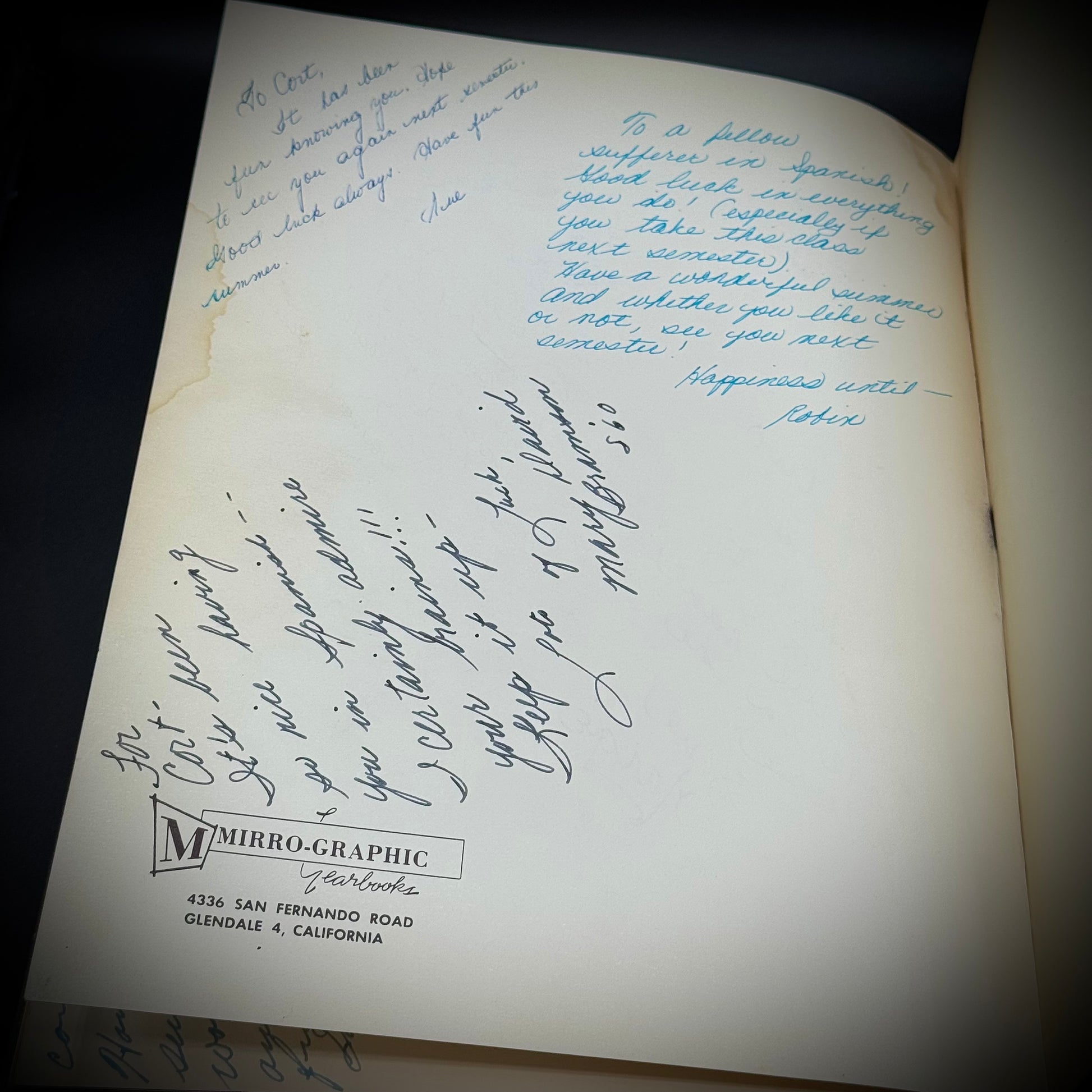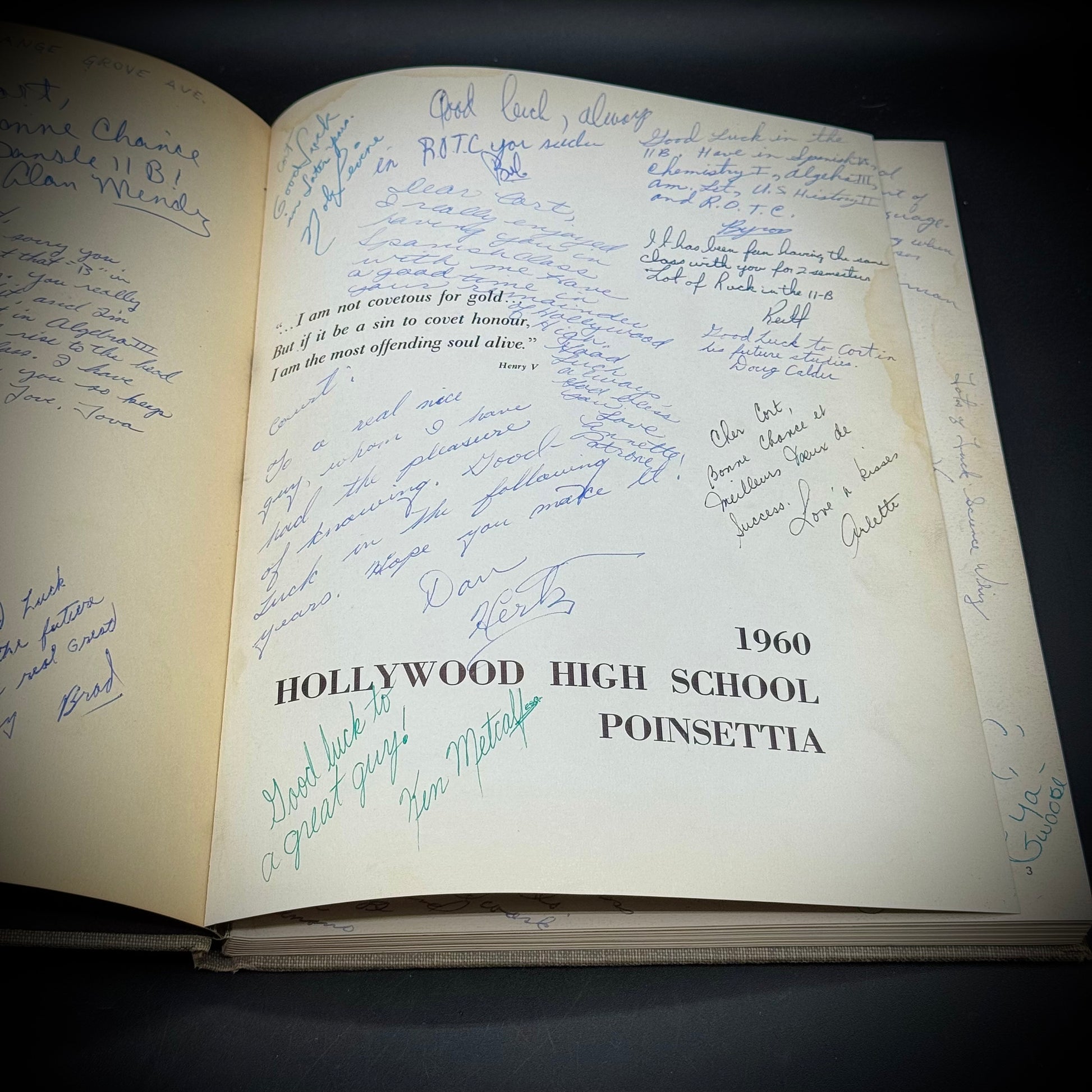 Incredible piece of Hollywood History. Hollywood High School is where Natalie Wood, Jamie Lee Curtis and many more stars attended grades 9-12. This 1960 yearbook is full of autographs, photographs and text about the classes from this era. Attendees include Stephanie Powers and Swoosie Kurtz, who signed on the first page.