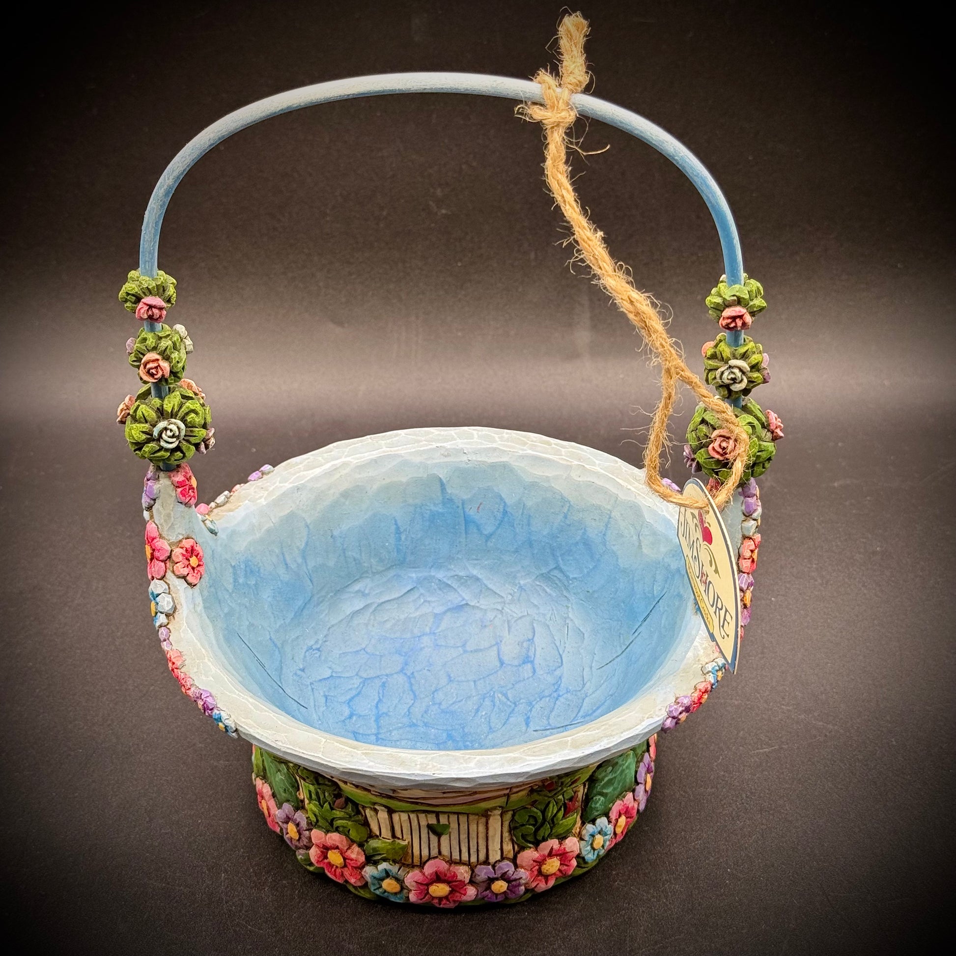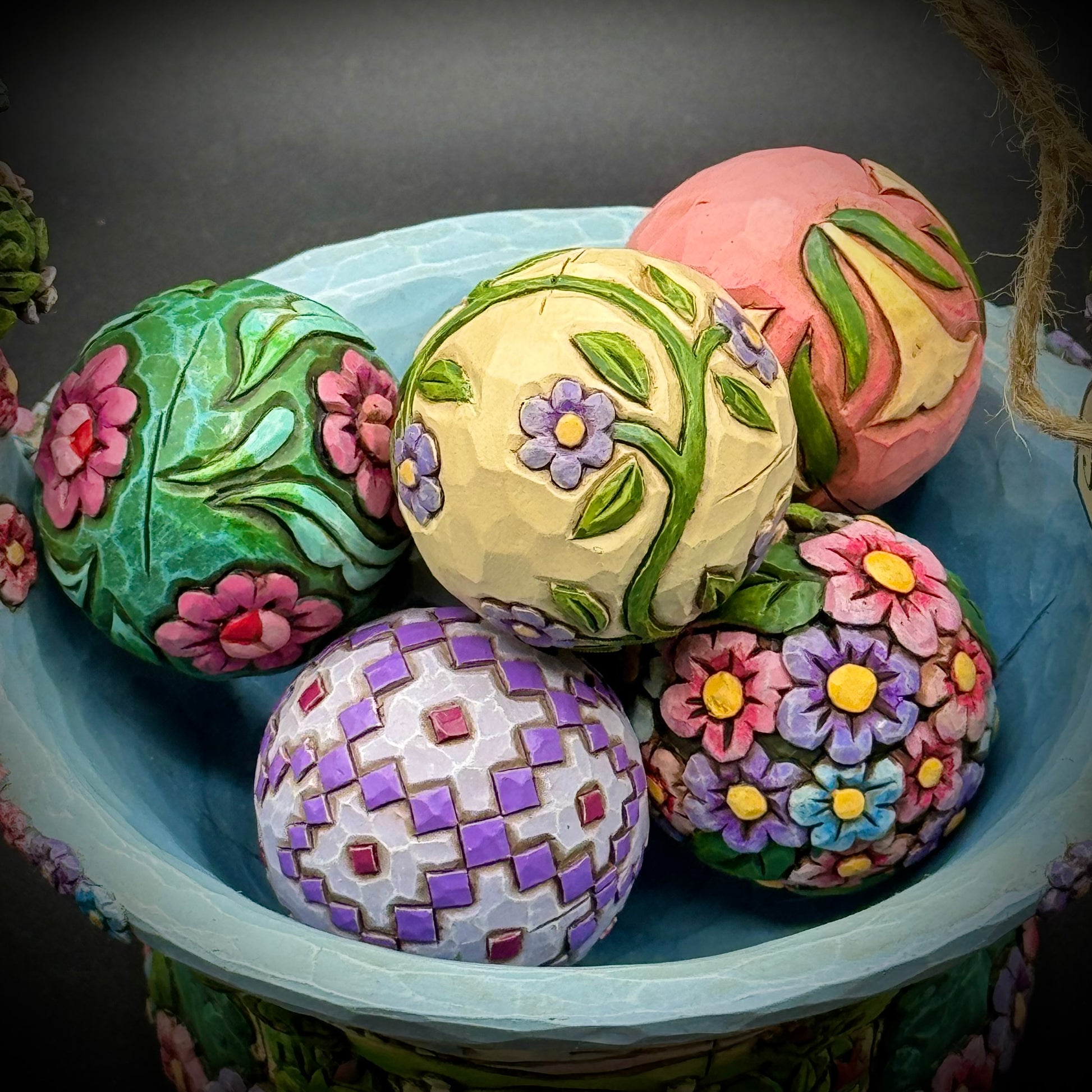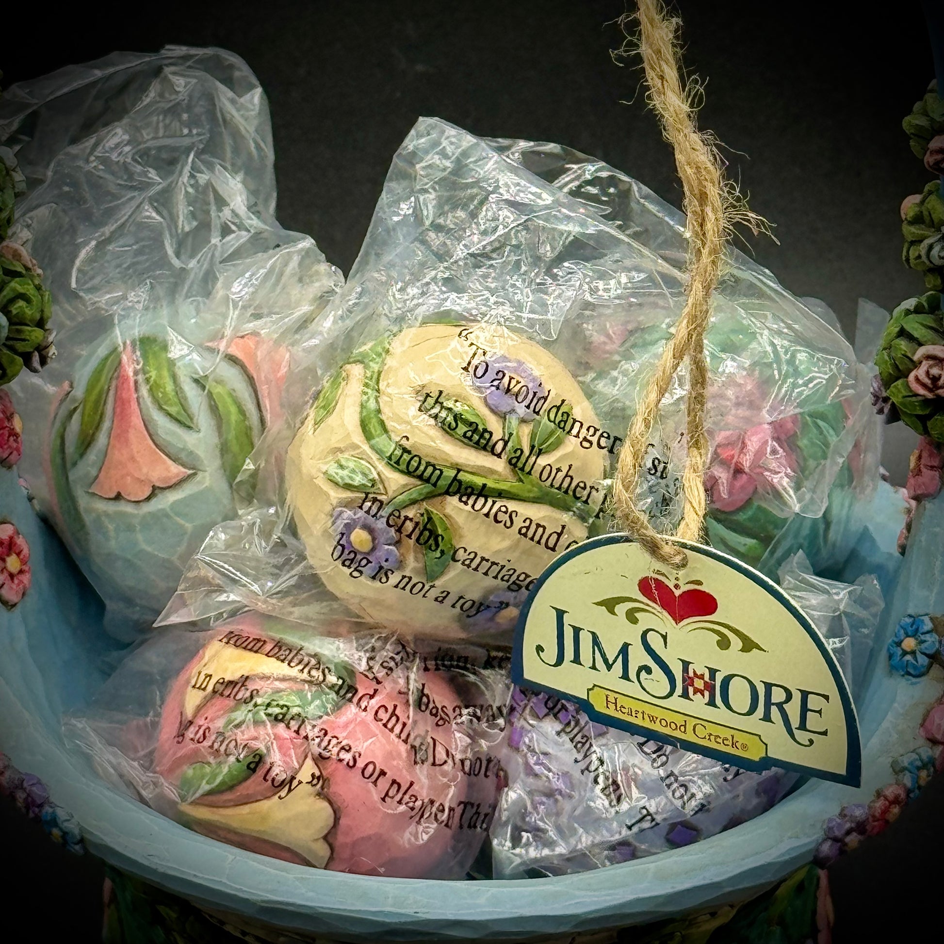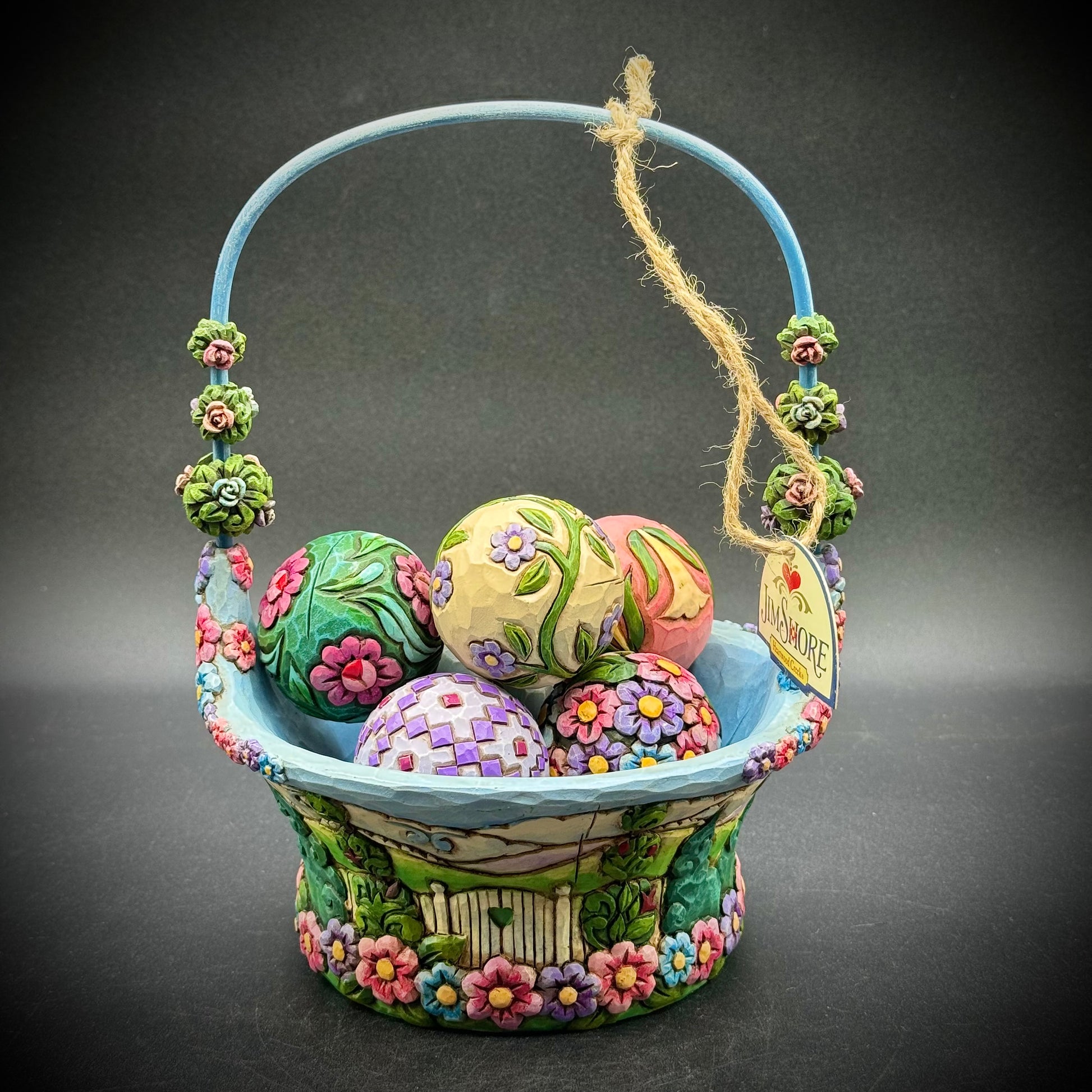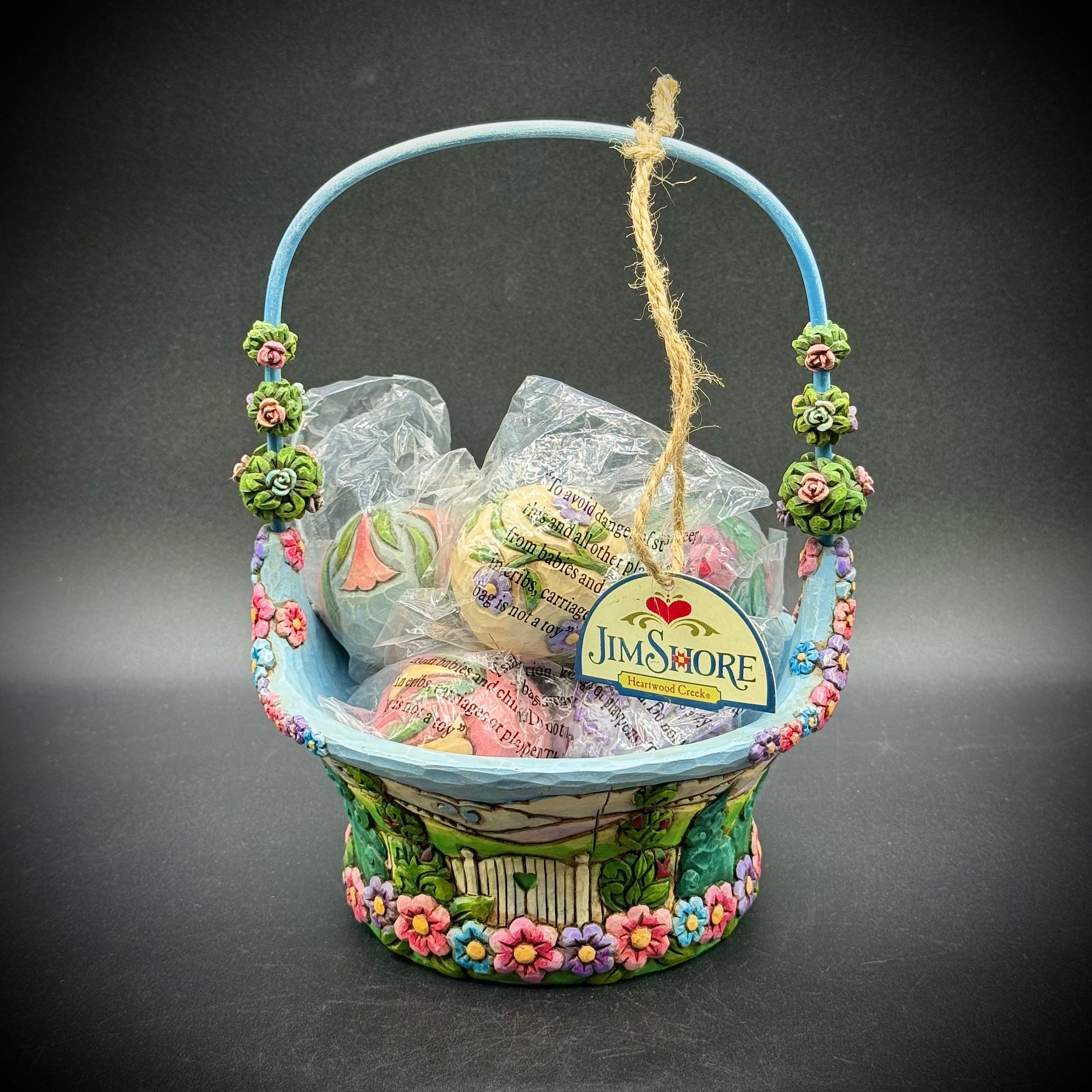 Delightful and colorful set from Heartwood Creek Jim Shore. This ornate basket comes with whimsical decorative balls that just scream Spring!
