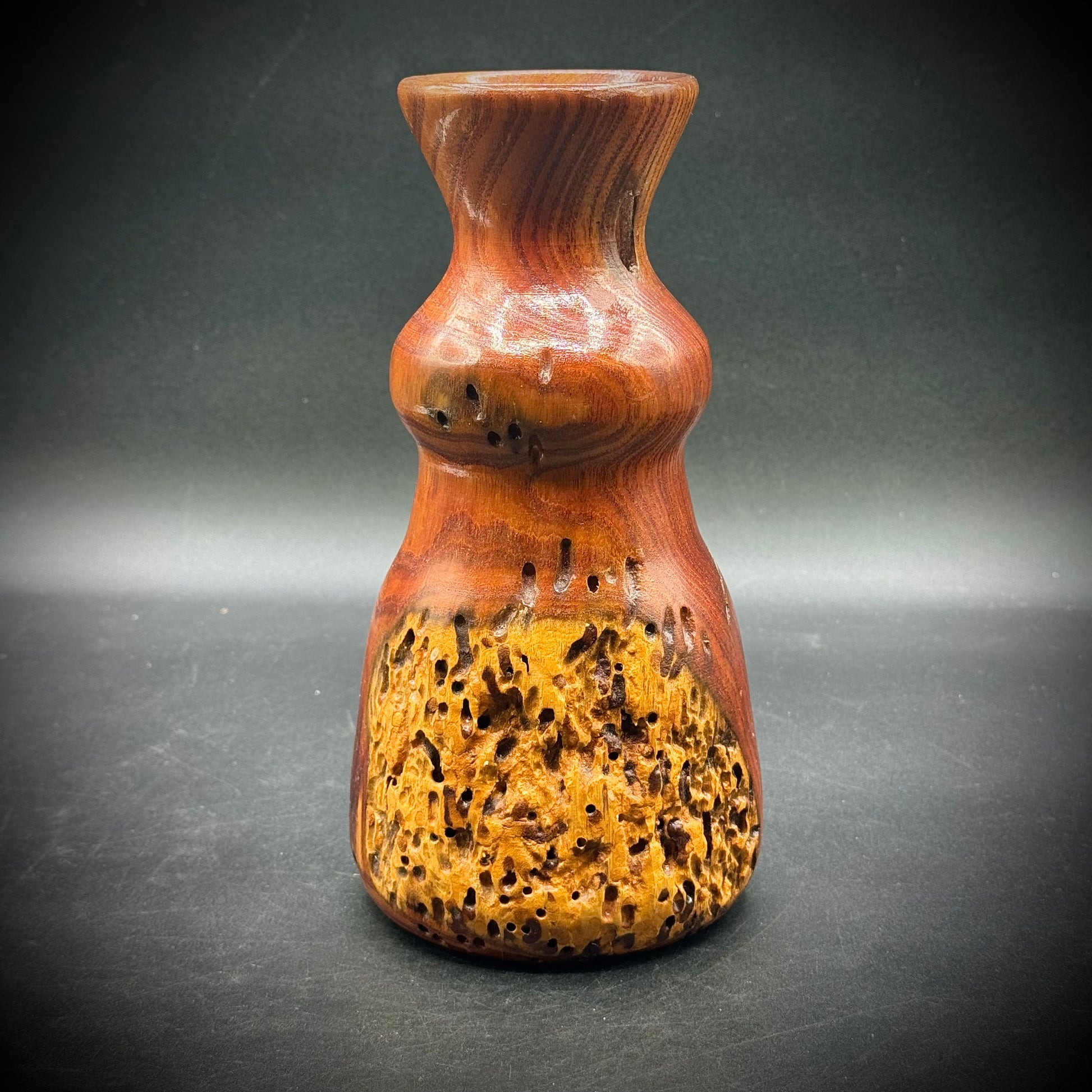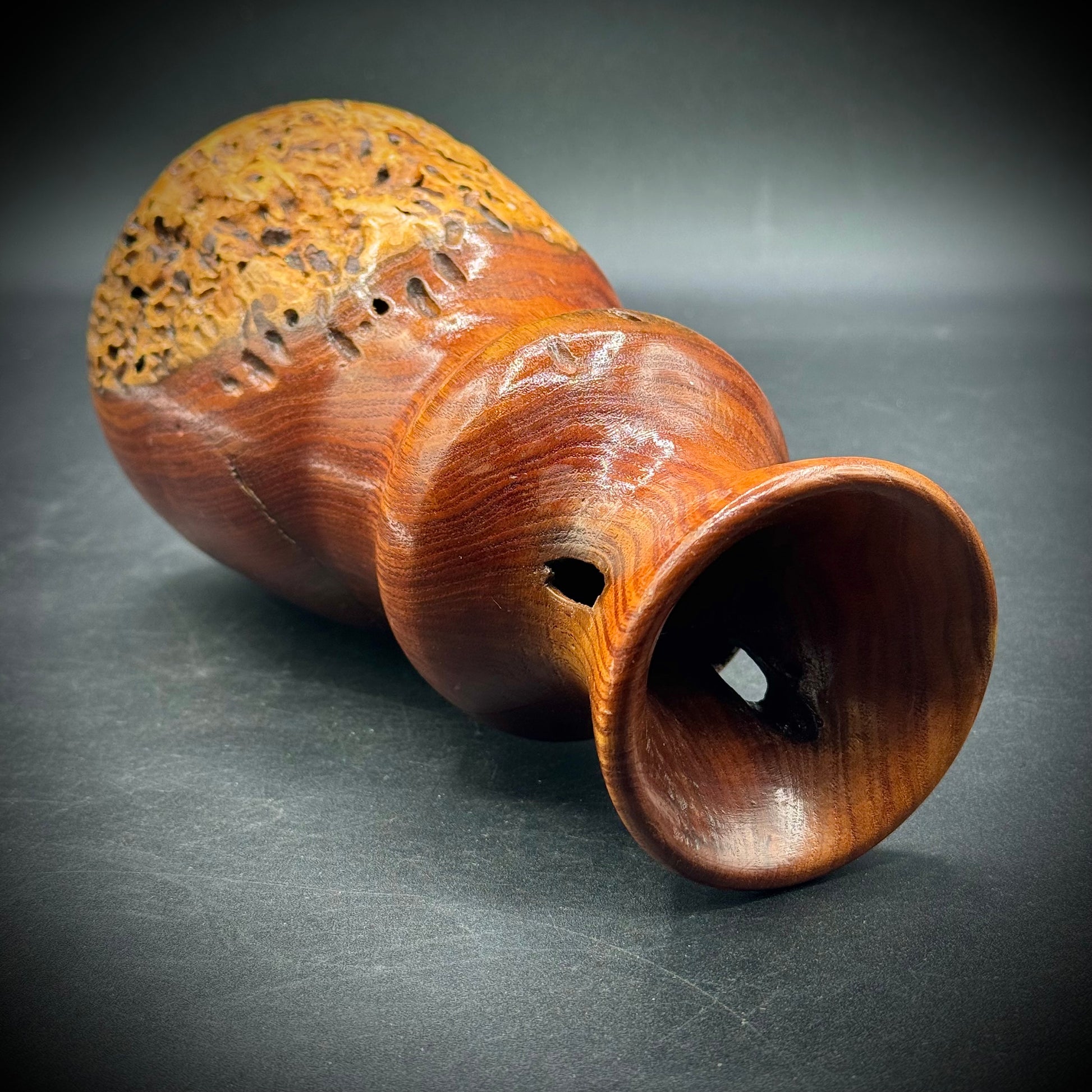 Stunning natural design with live edges. Please note: this vase is not designed to hold water. There are natural openings so it would be for dried flowers only.