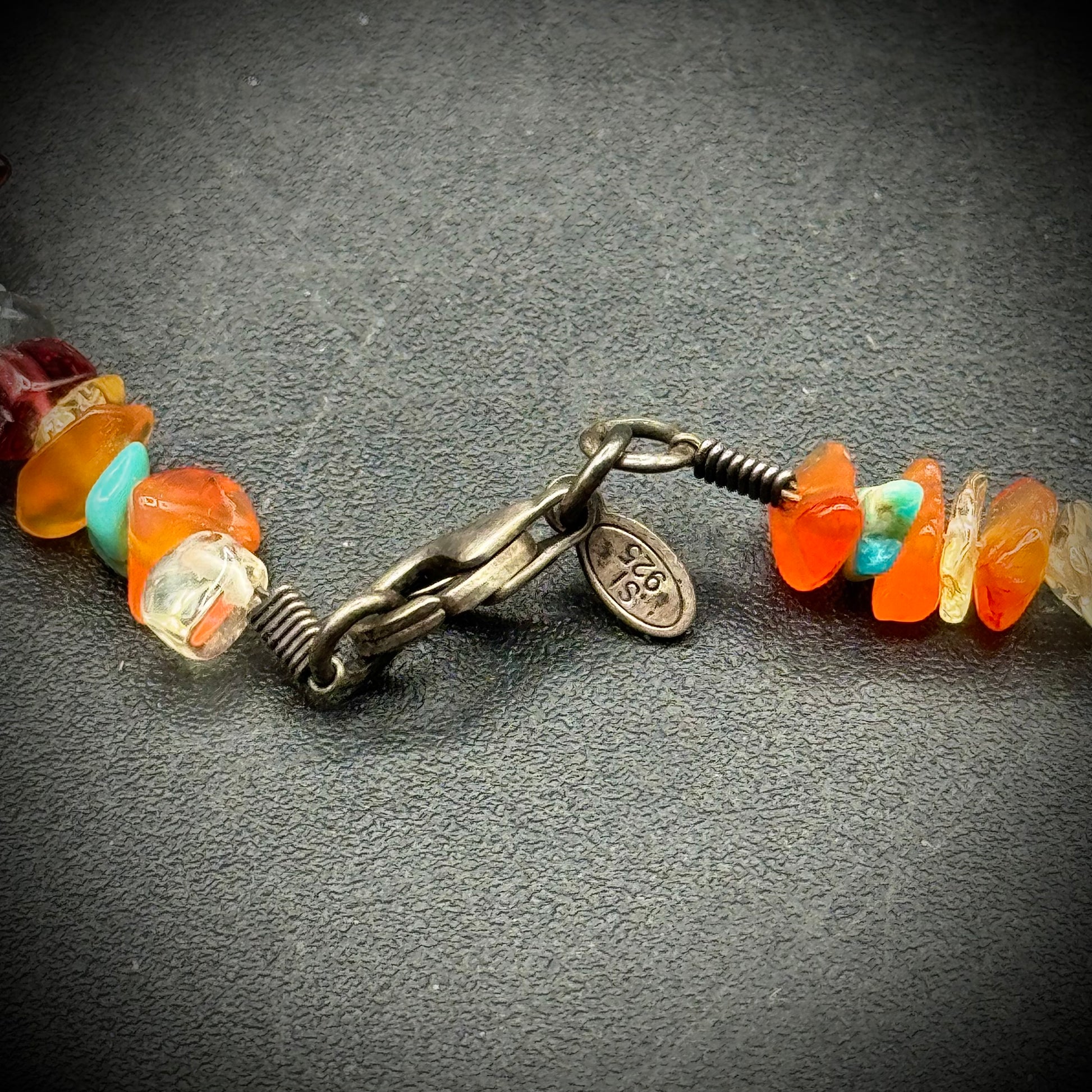 Absolutely stunning piece of jewelry with amethyst, turquoise, coral and more with a .925 marked clasp. Measures 48" in length.