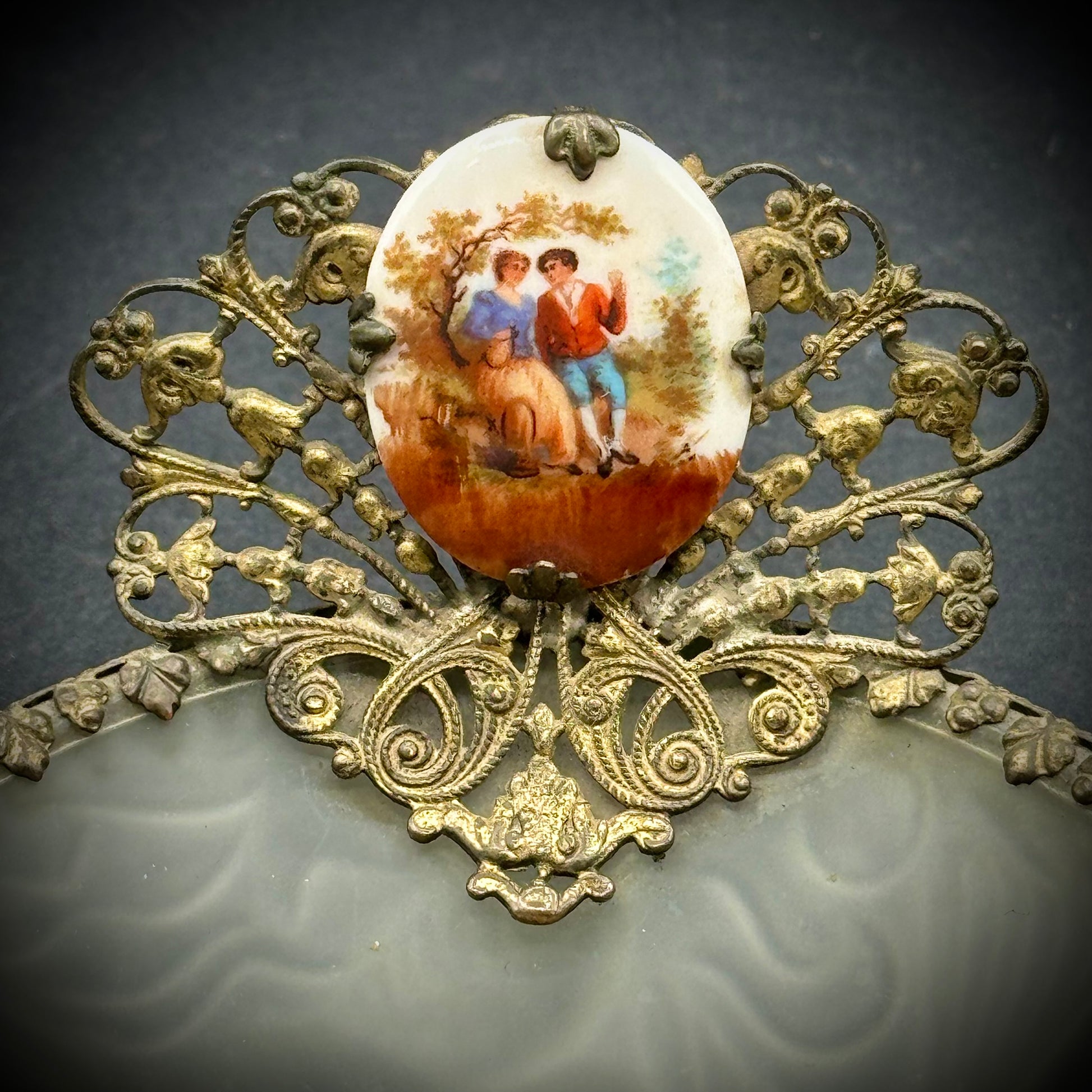 Metal, Porcelain & Art Glass Dish with Courting Couple & Bird Motif