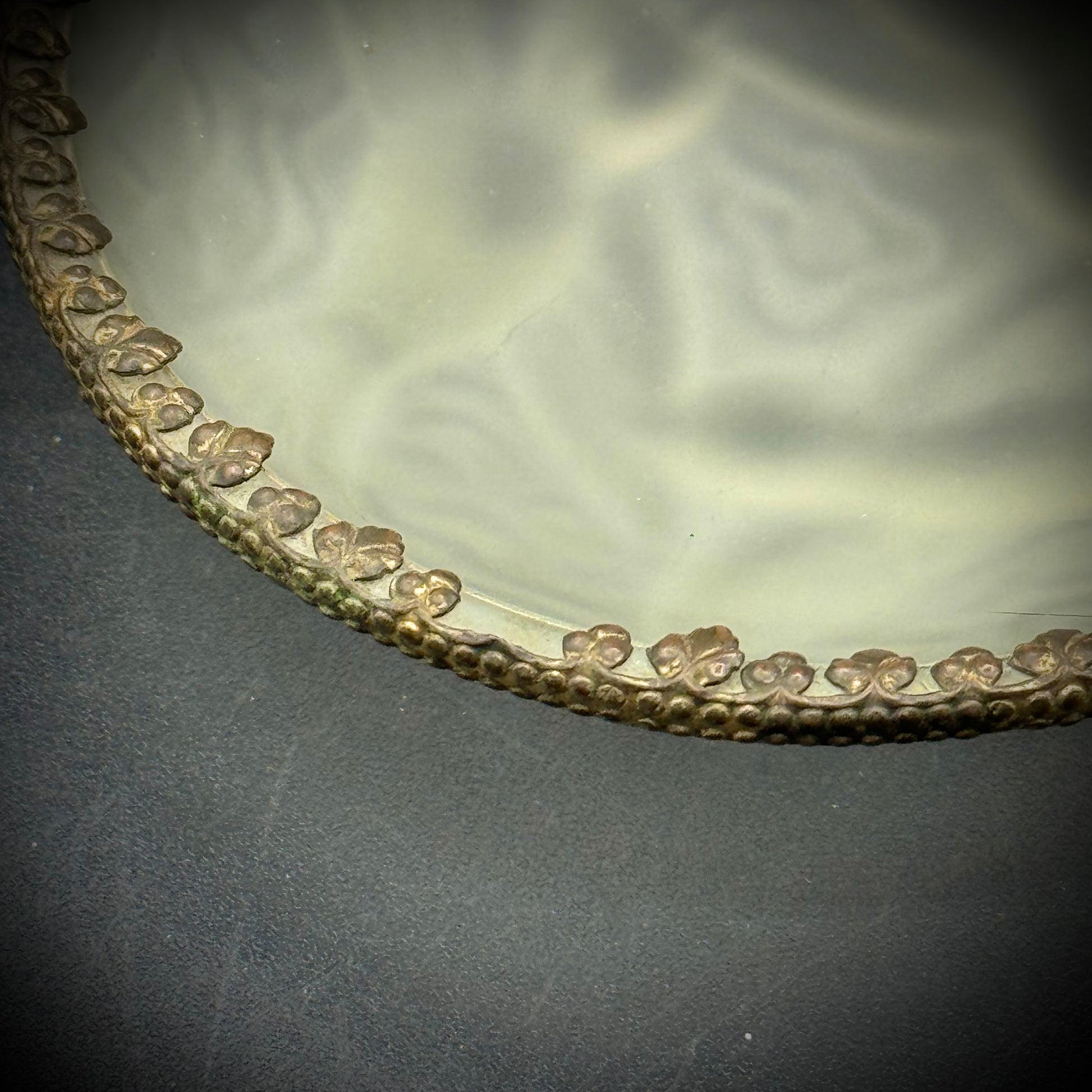 Similar examples sell for over $125.00. Please note: as shown in the photos, one of the metal accents on the rim is missing and as such, we have priced the item accordingly.