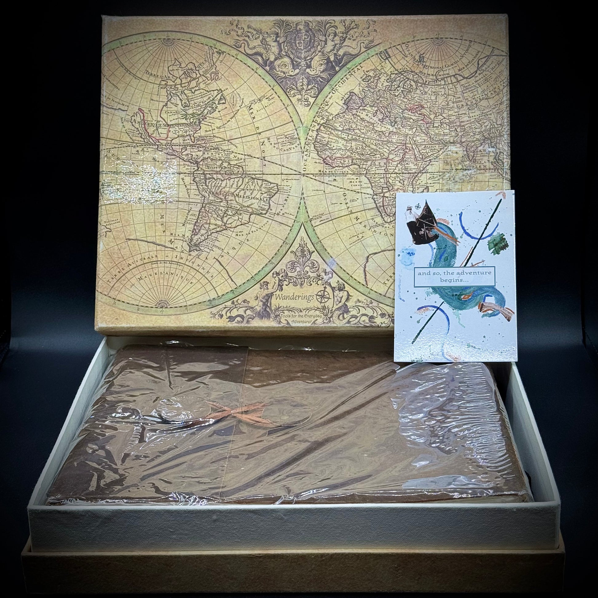 Absolutely stunning leather and hand made paper journal from Wanderings. Comes new in the box with original plastic wrap and a linen bag to store the book in.