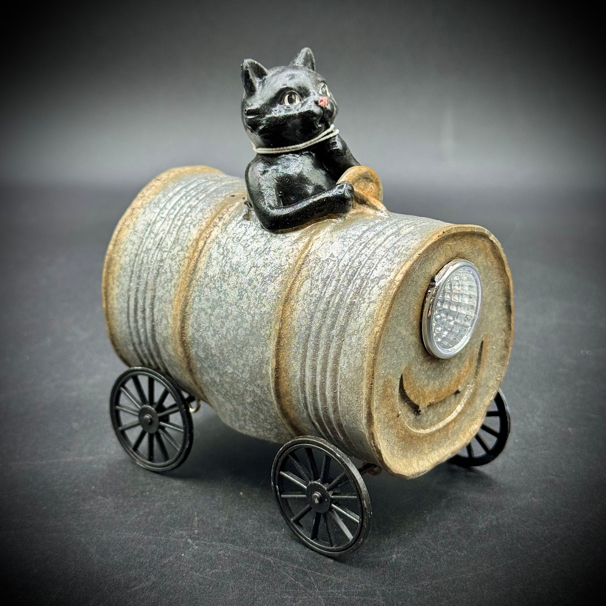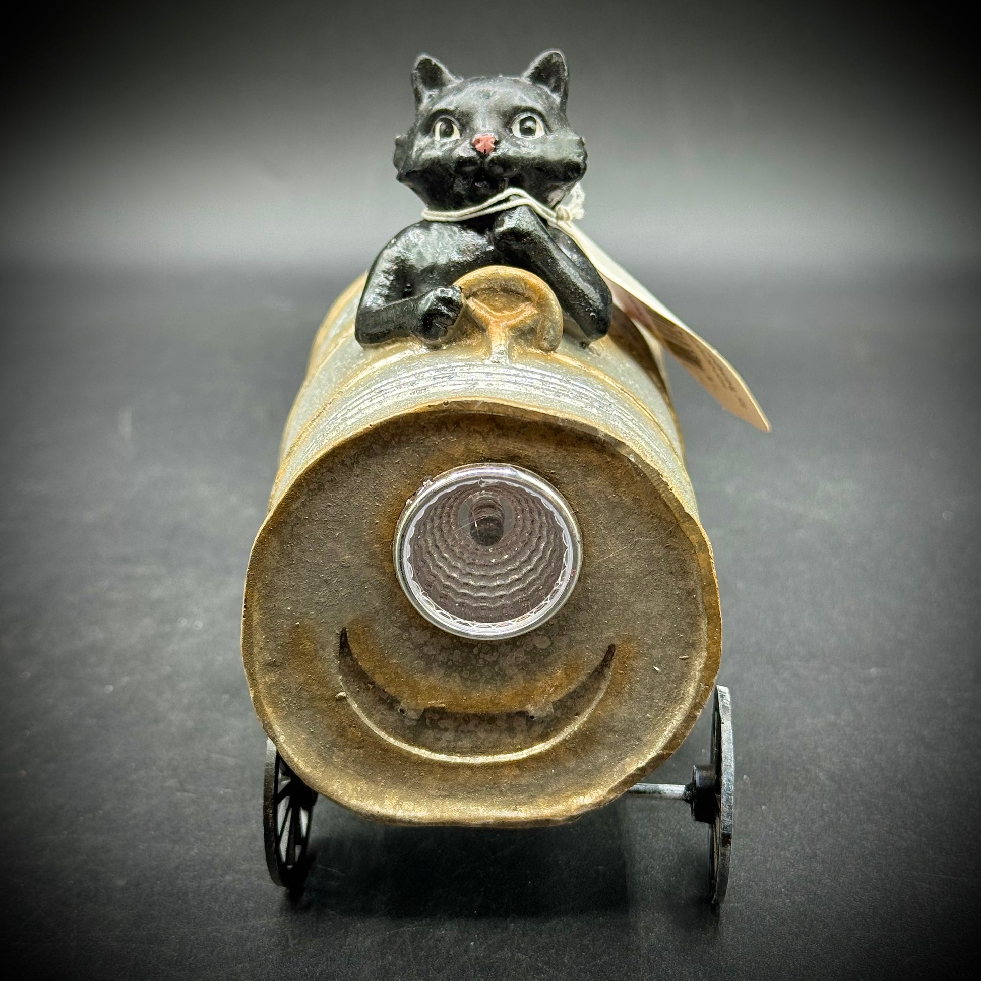 This fun and whimsical piece of Halloween decor depicts a black cat in a barrel. It lights up and is in full, new, working order. There is a small plastic insert keeping the battery from being used. Simply remove that and it is ready to display!