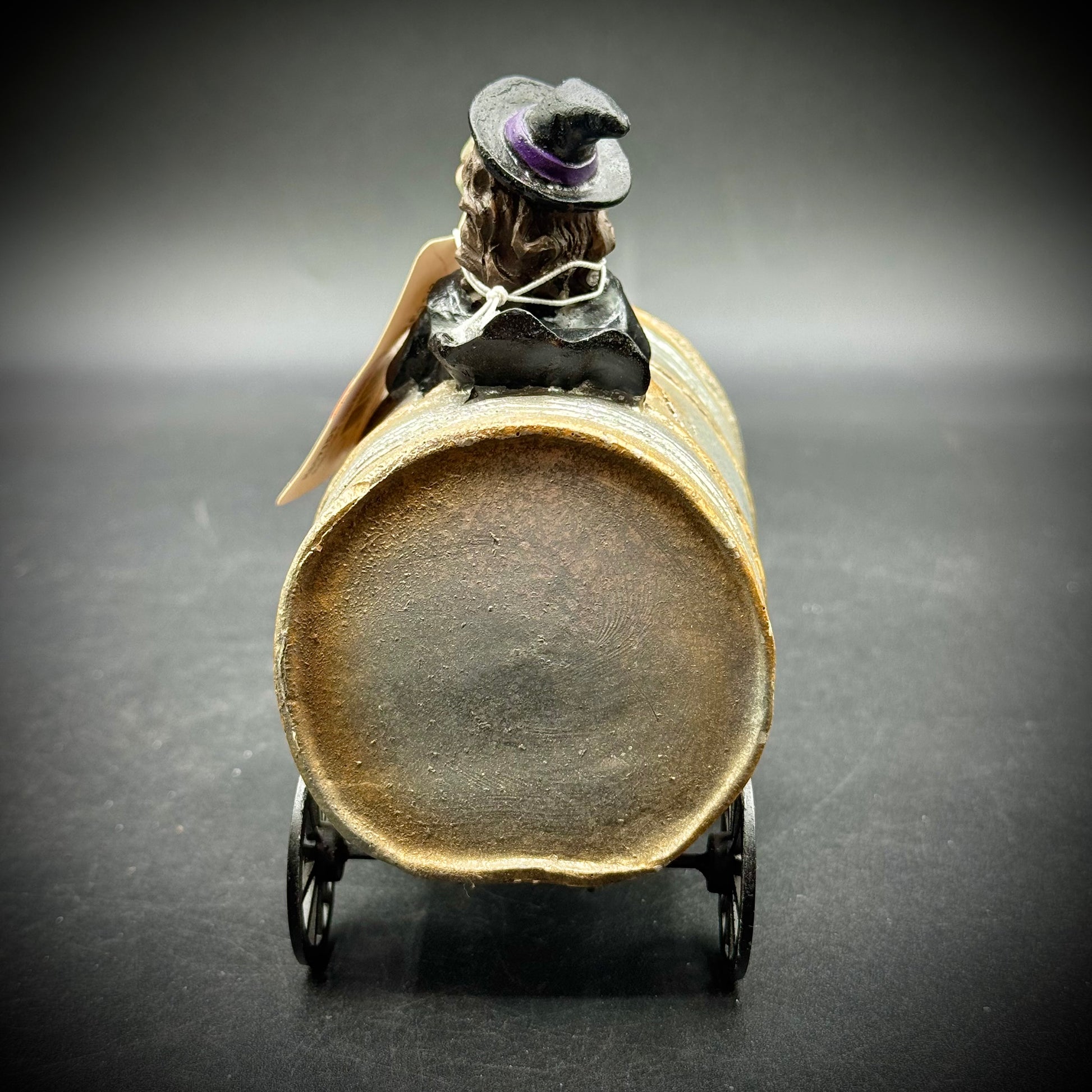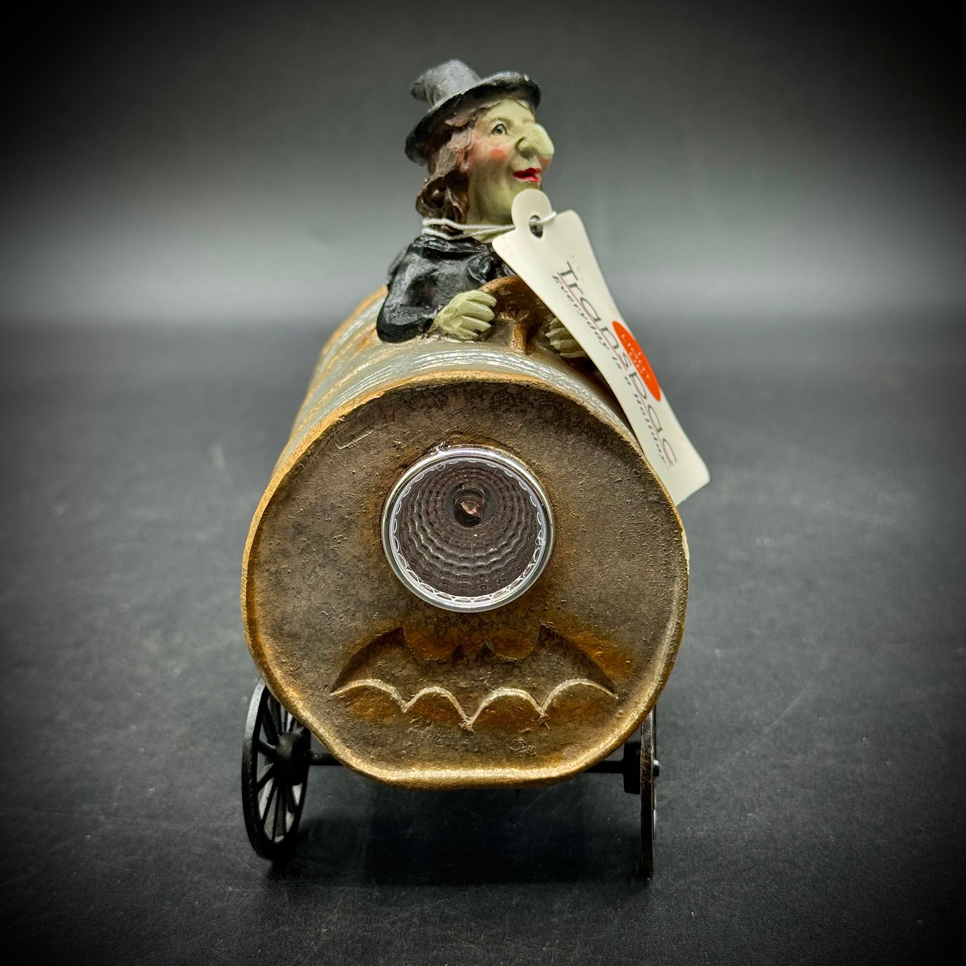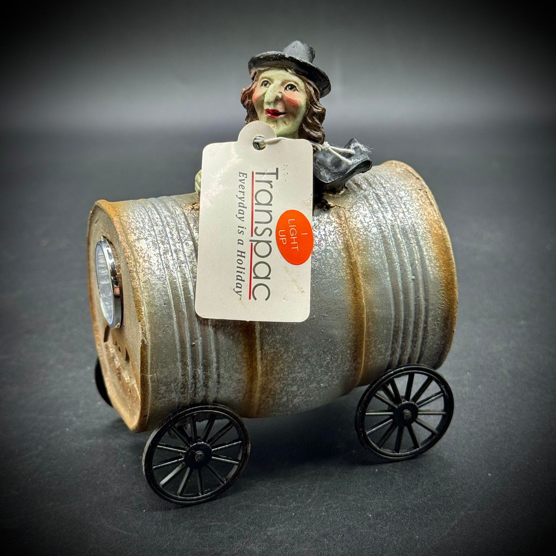 This fun and whimsical piece of Halloween decor depicts a witch in a barrel. It lights up and is in full, new, working order. There is a small plastic insert keeping the battery from being used. Simply remove that and it is ready to display!