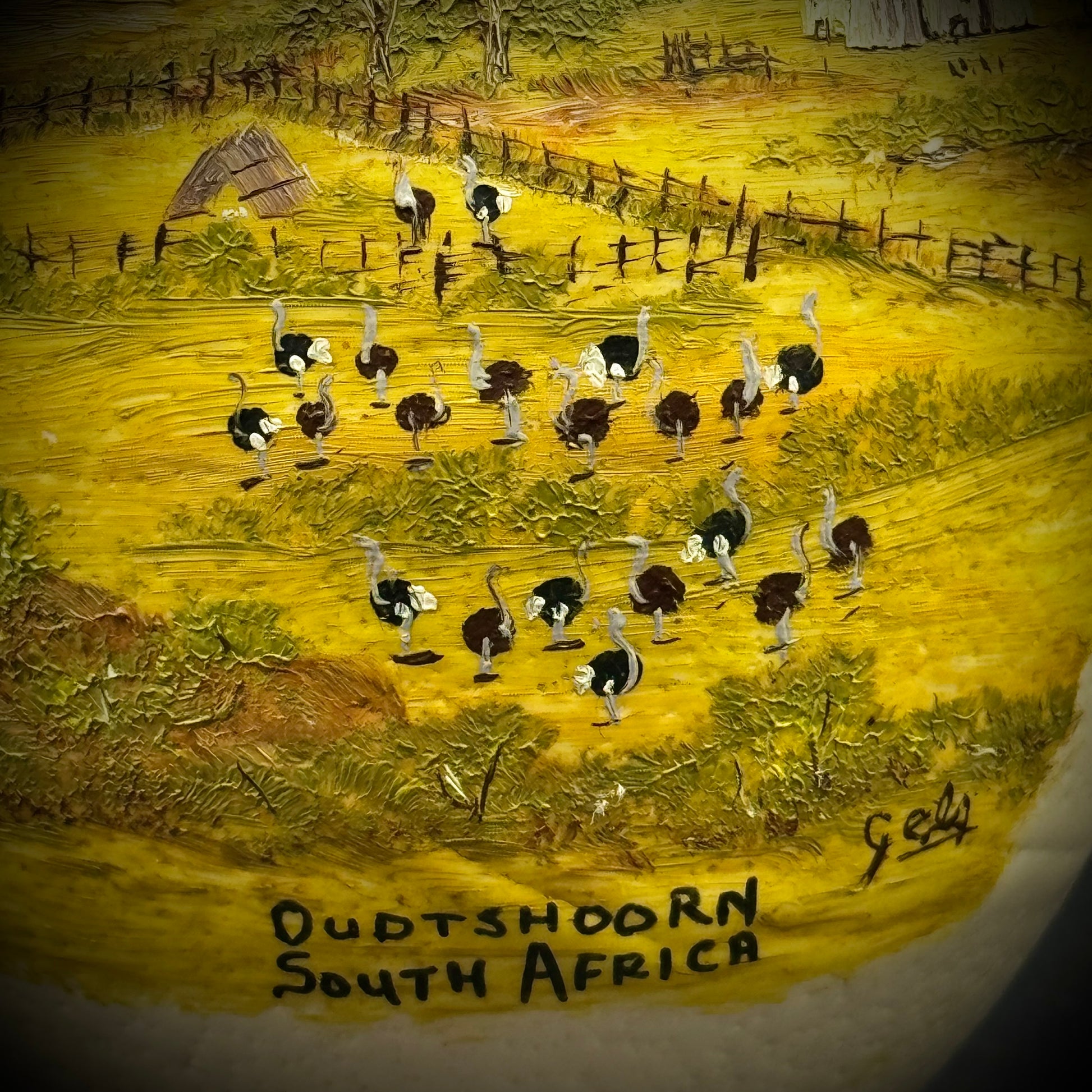 A beautiful hand painted Ostrich Egg depicting an Ostrich farm in South Africa.