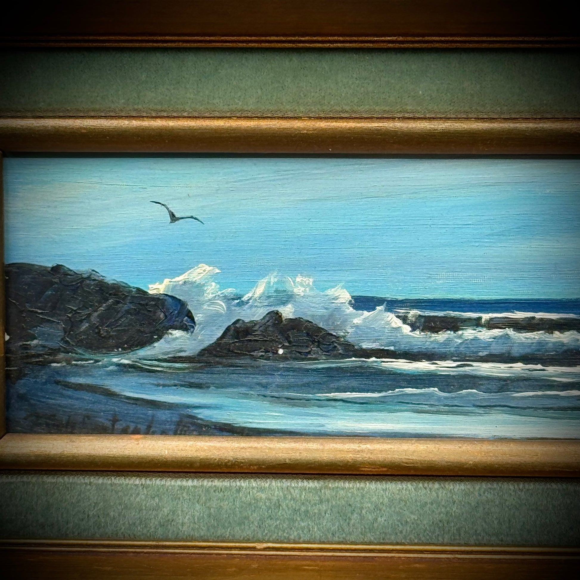 Beautiful, professionally painted and framed ocean scene, signed by the artist. Original oil on board. Measures 12" by 6.5"