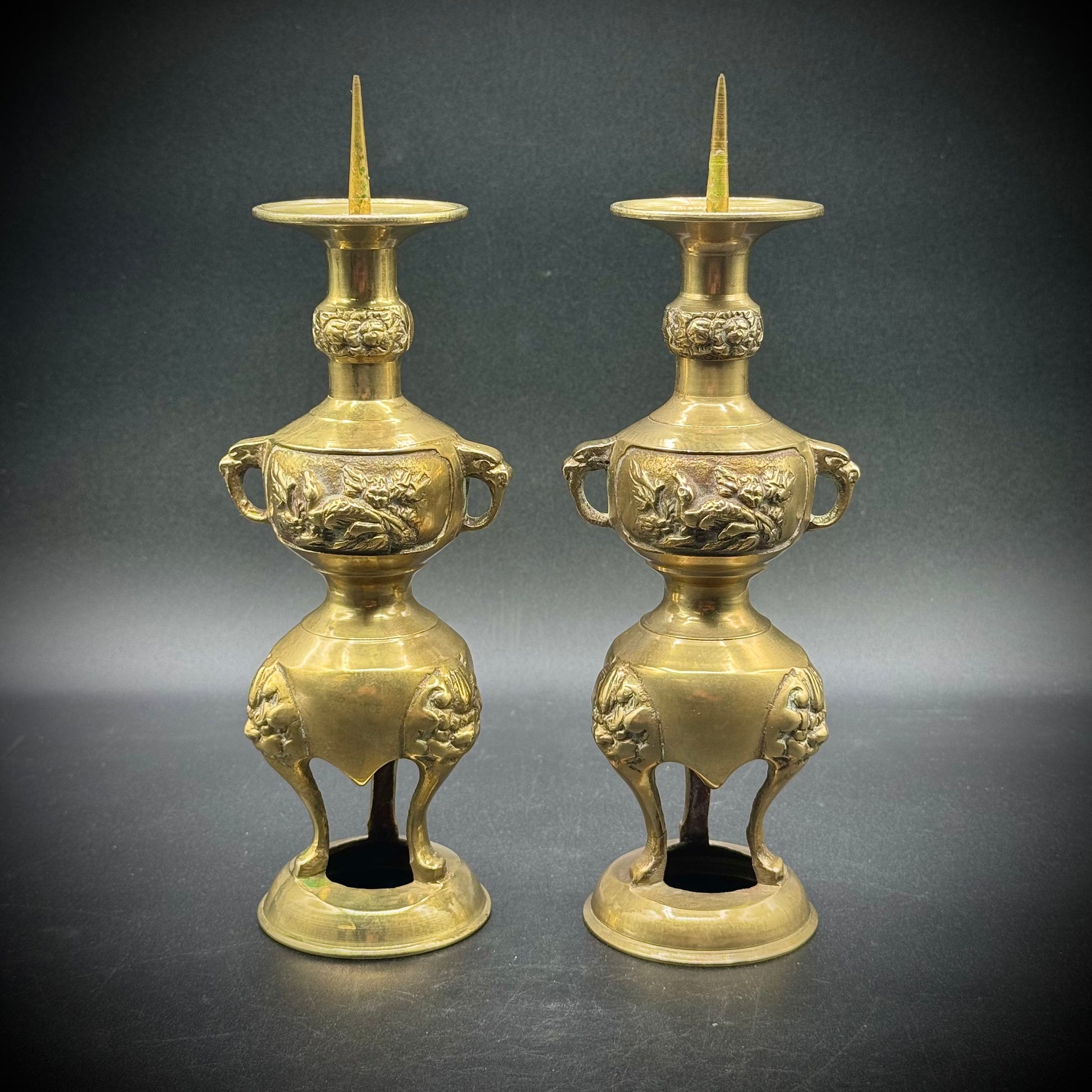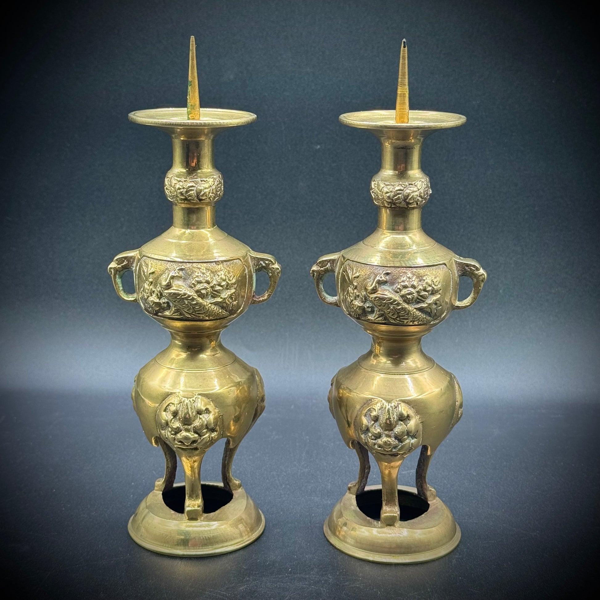 Pair of Meiji Era Brass Candlesticks with Peacock Motif - Made in Japan