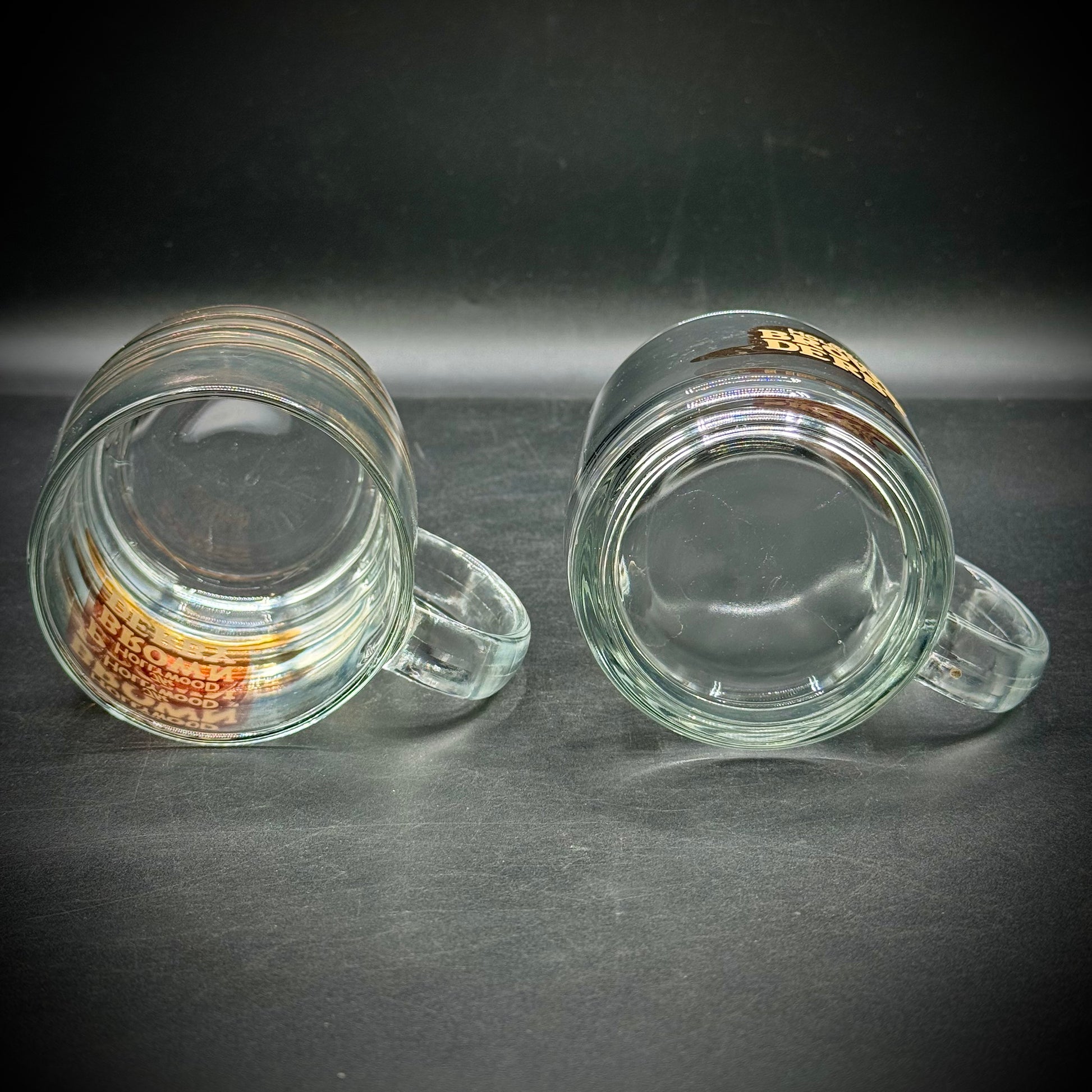 Heavy mugs with the logo of the iconic location on both. Please note there is some gold loss on the logos, but that is expected with pieces of this age.