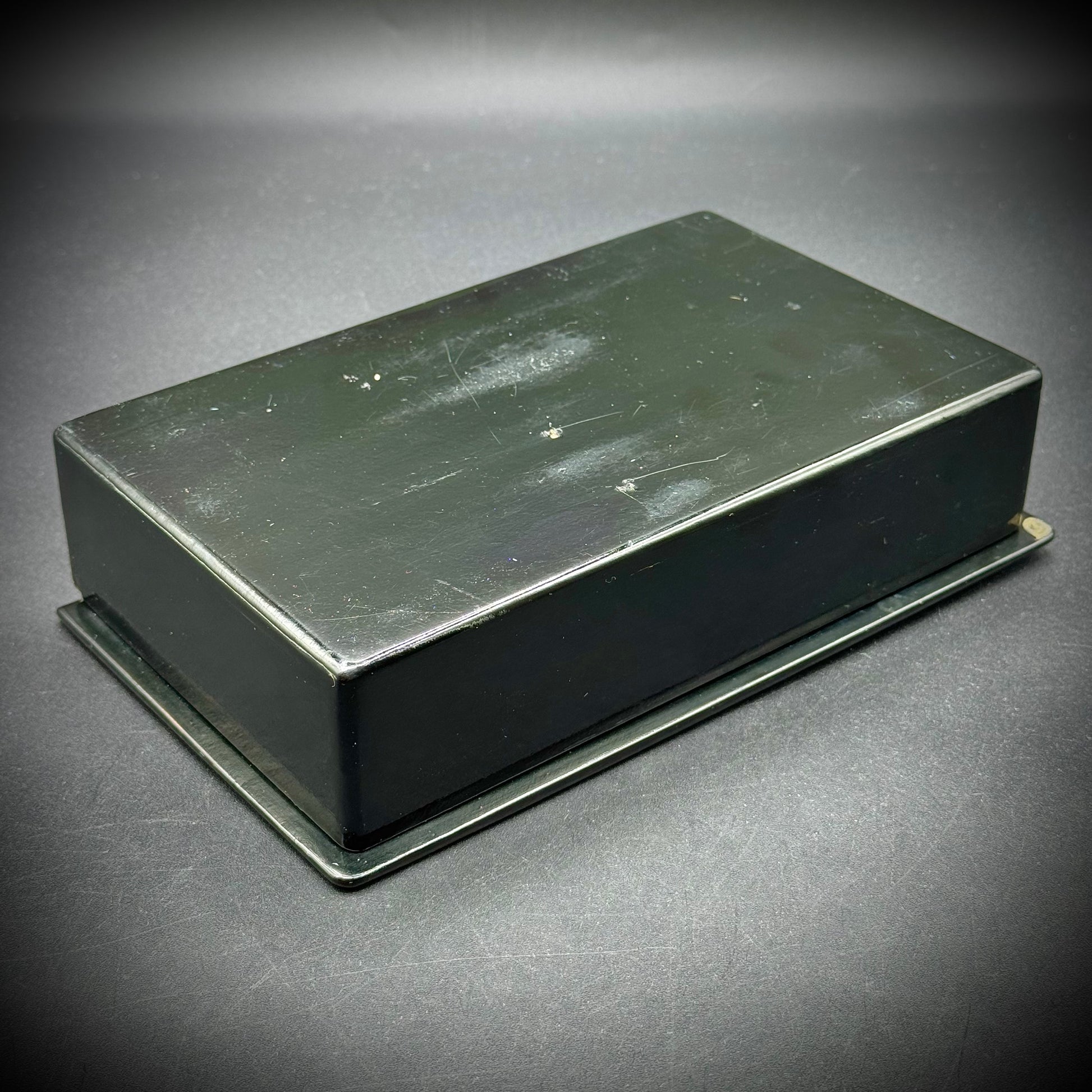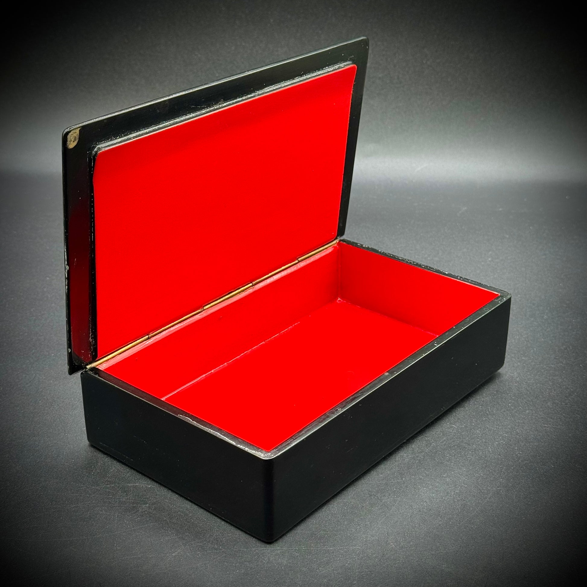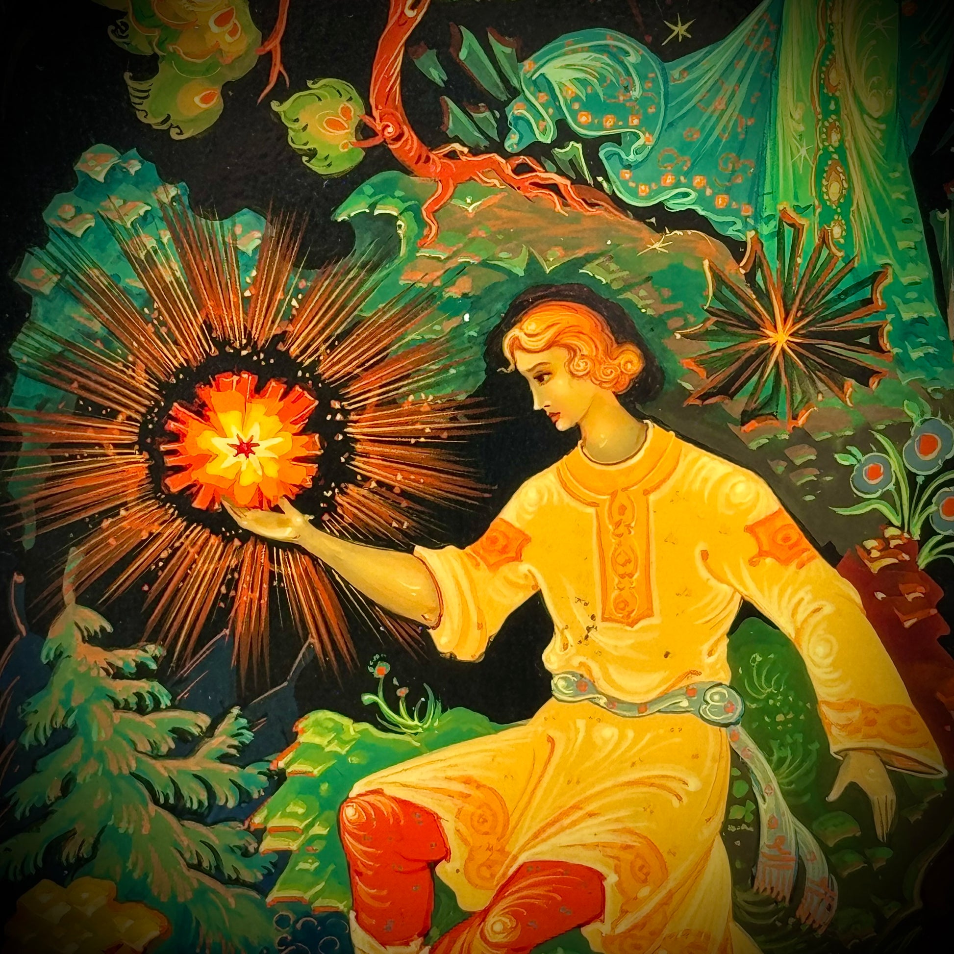 A stunning example of antique Russian lacquerware with an ornate, detailed and vibrant painting on the lid depicting a scene from Eastern Folk Lore. The inside is painted with a bold red color. This highly sought after box has similar examples selling for over $450.00 online.