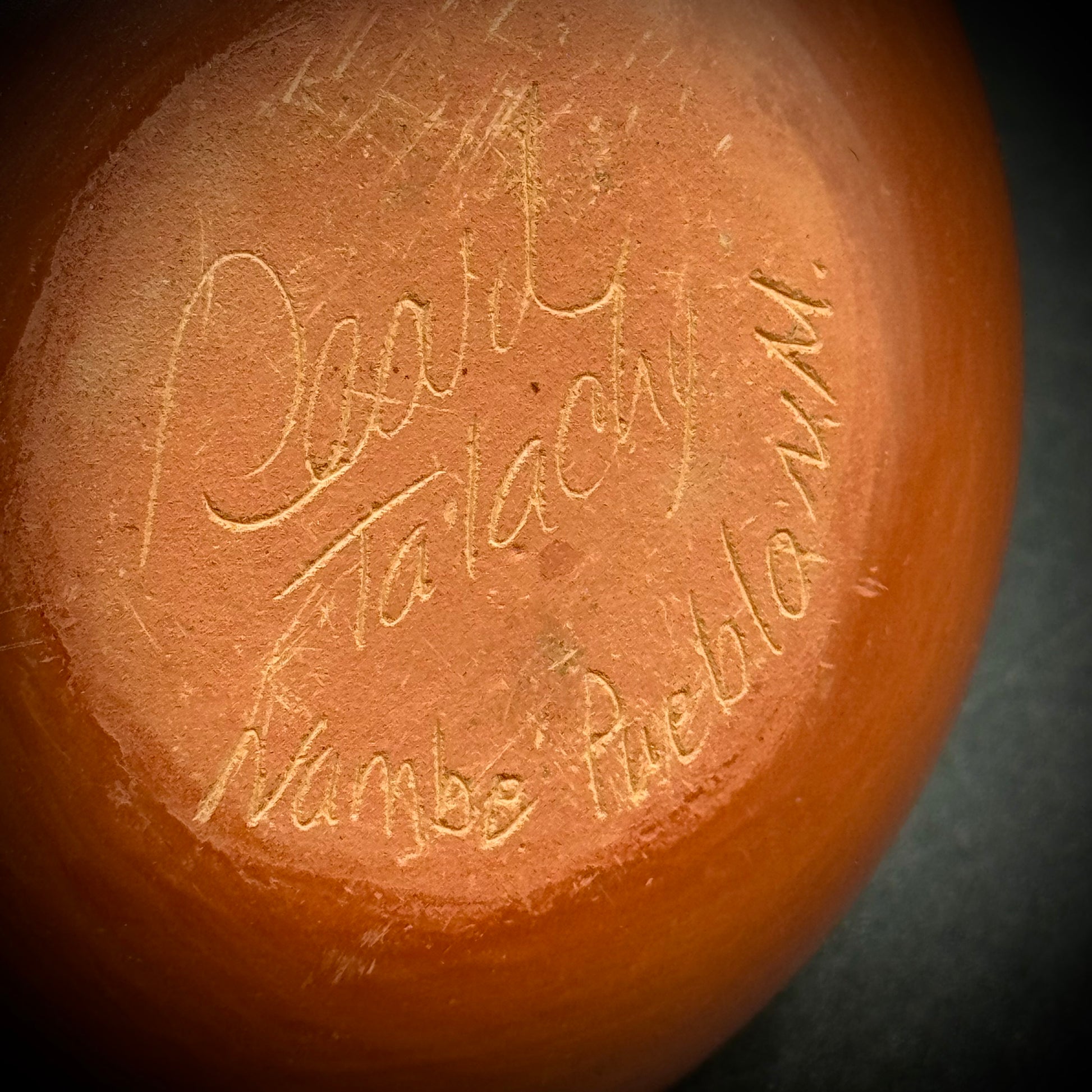 Pearl Talachy (1927–2019) was a distinguished potter from Nambe Pueblo in northern New Mexico, known for her mastery of traditional Native American pottery. Raised in a family of artisans, Pearl honed her skills in the ancient methods of hand-coiling and firing pottery. She was celebrated for her finely detailed, coil-built vessels, often embellished with striking geometric designs, symbolic of Nambe Pueblo’s cultural heritage. Pearl’s work reflects a deep connection to her heritage, blending artistry with traditional techniques passed down through generations. Her pottery gained widespread recognition, and her legacy continues to inspire Native American potters today.