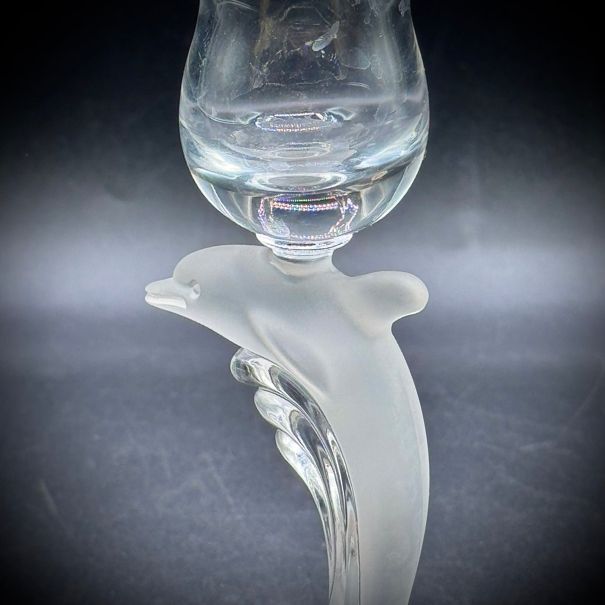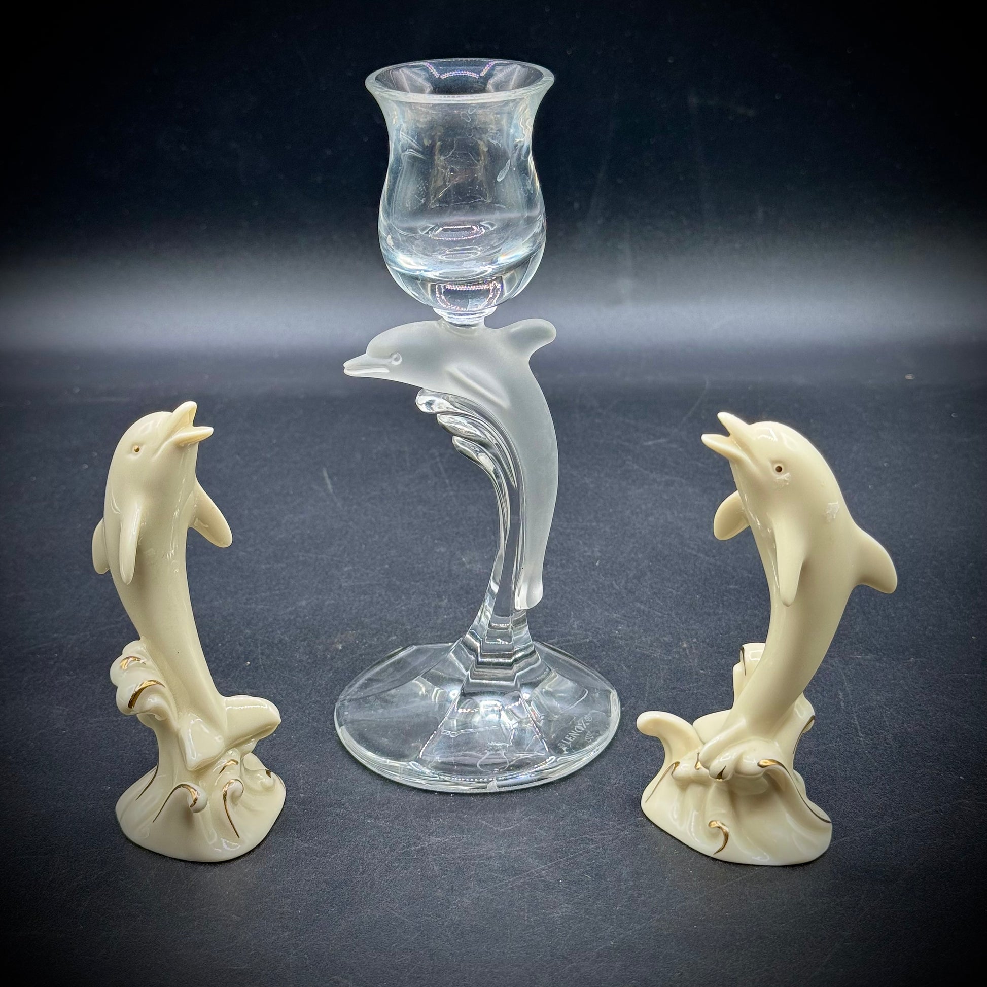 Two small Lenox dolphin figurines and one art glass dolphin candle stick.