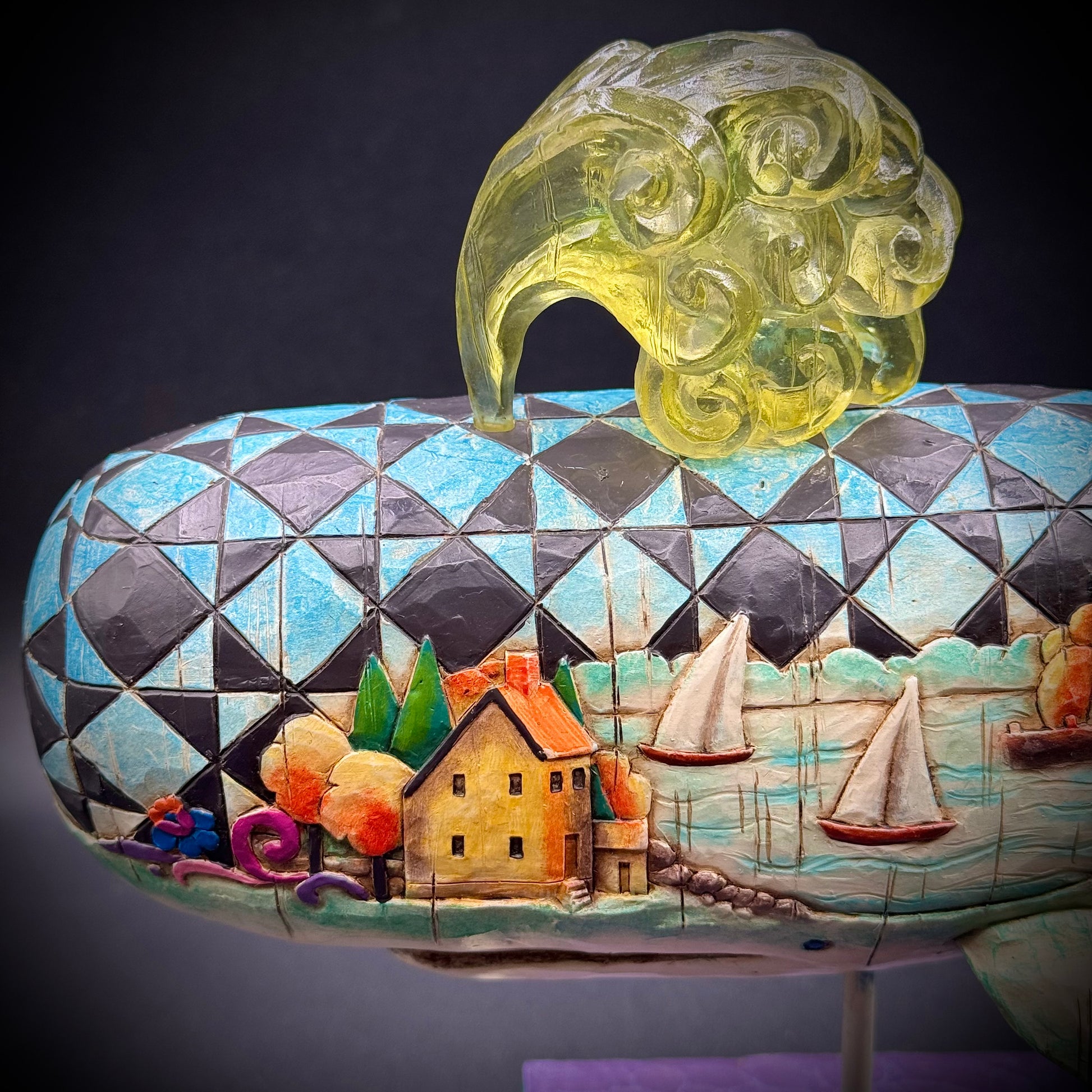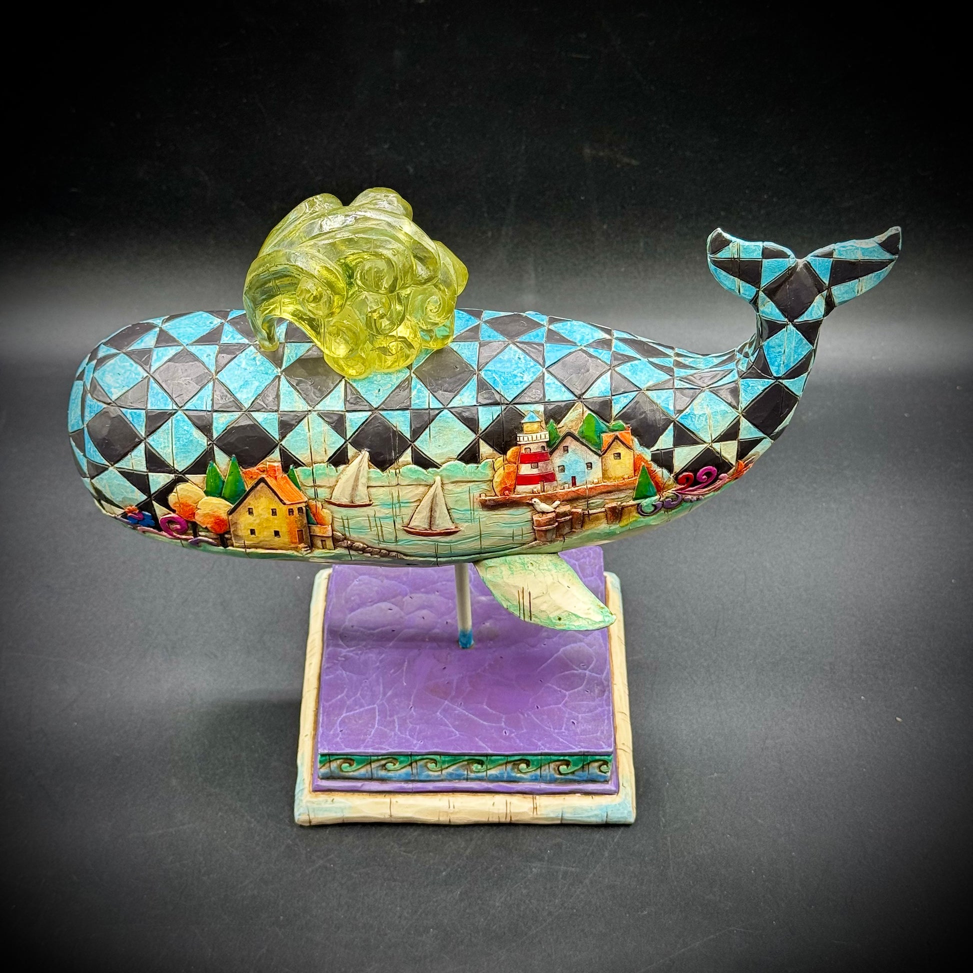 An incredibly detailed Jim Shore whale including a New England fishing village motif on both side.