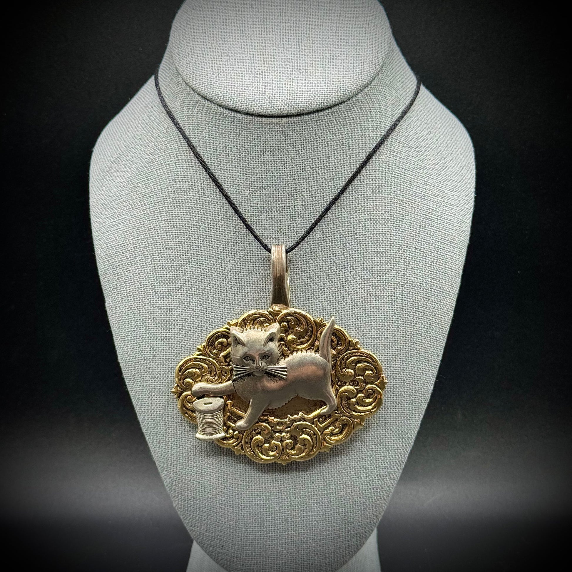 Fashioned from numerous sources, this adorable cat pendant comes on a 20" black silk rope.