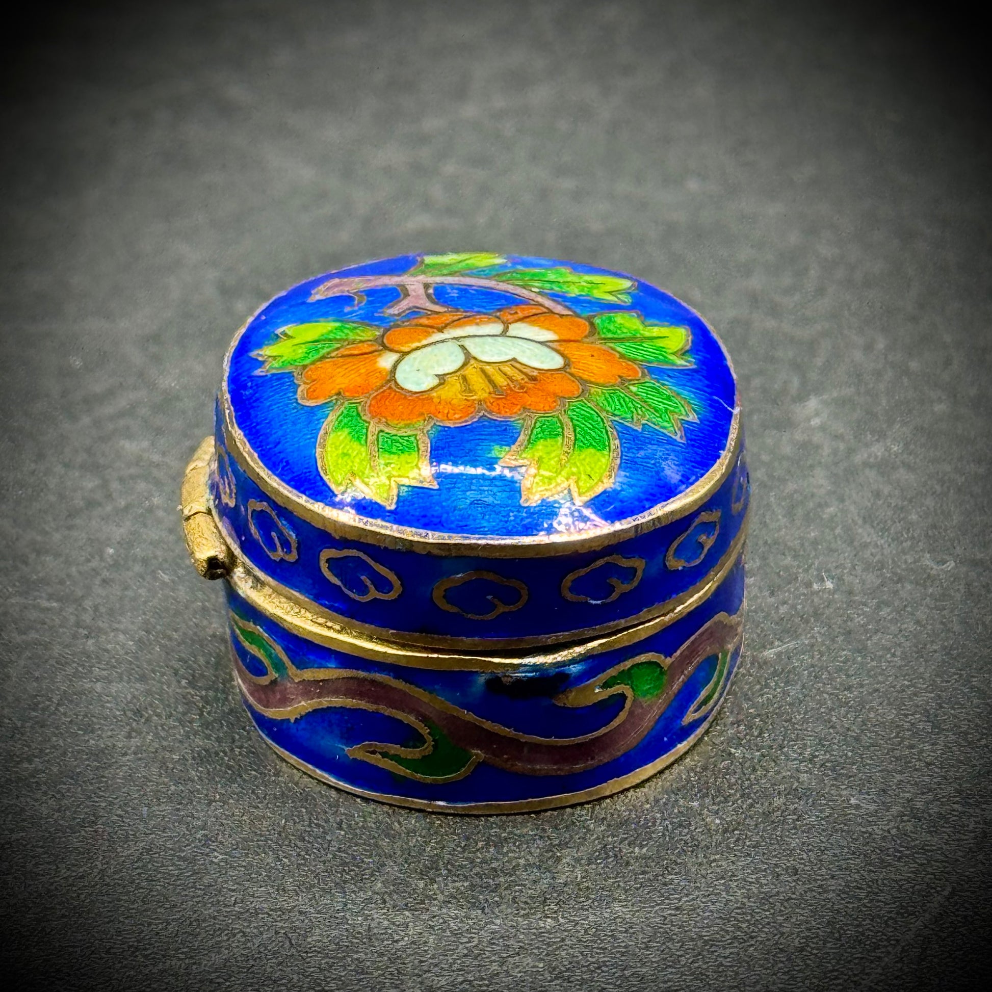 Stunning detail on this Cloisonne box with blue enameling, measuring 1.25" by .75"