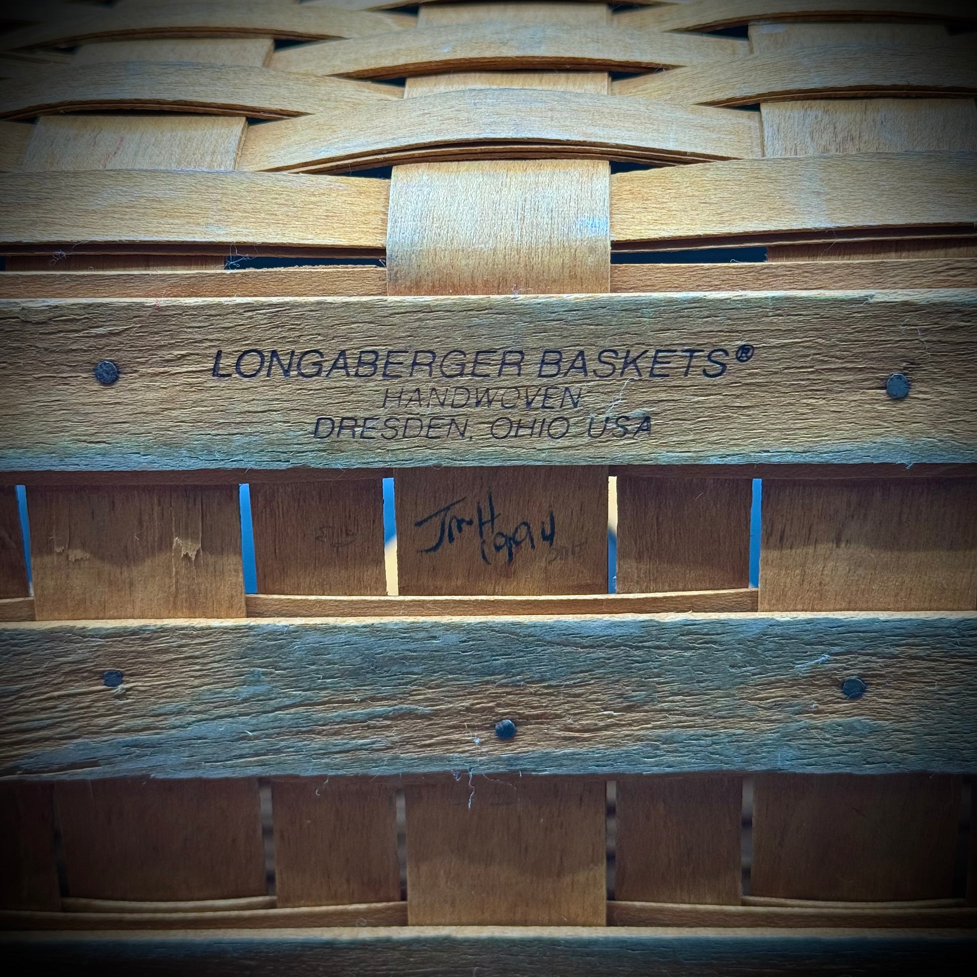 A beautiful, large Longaberger market basket with handles and copper button accents. Signed and dated 1994 on the bottom.