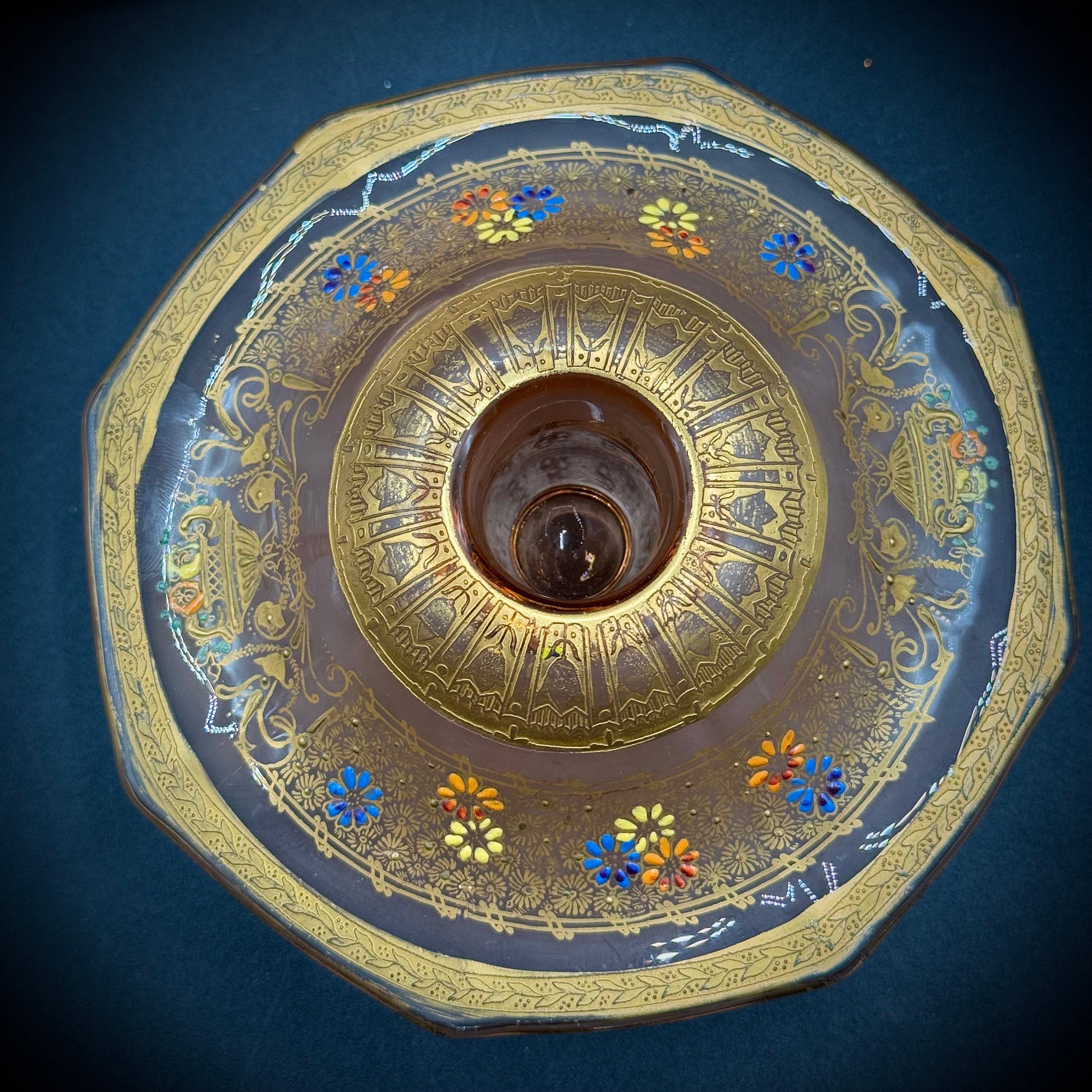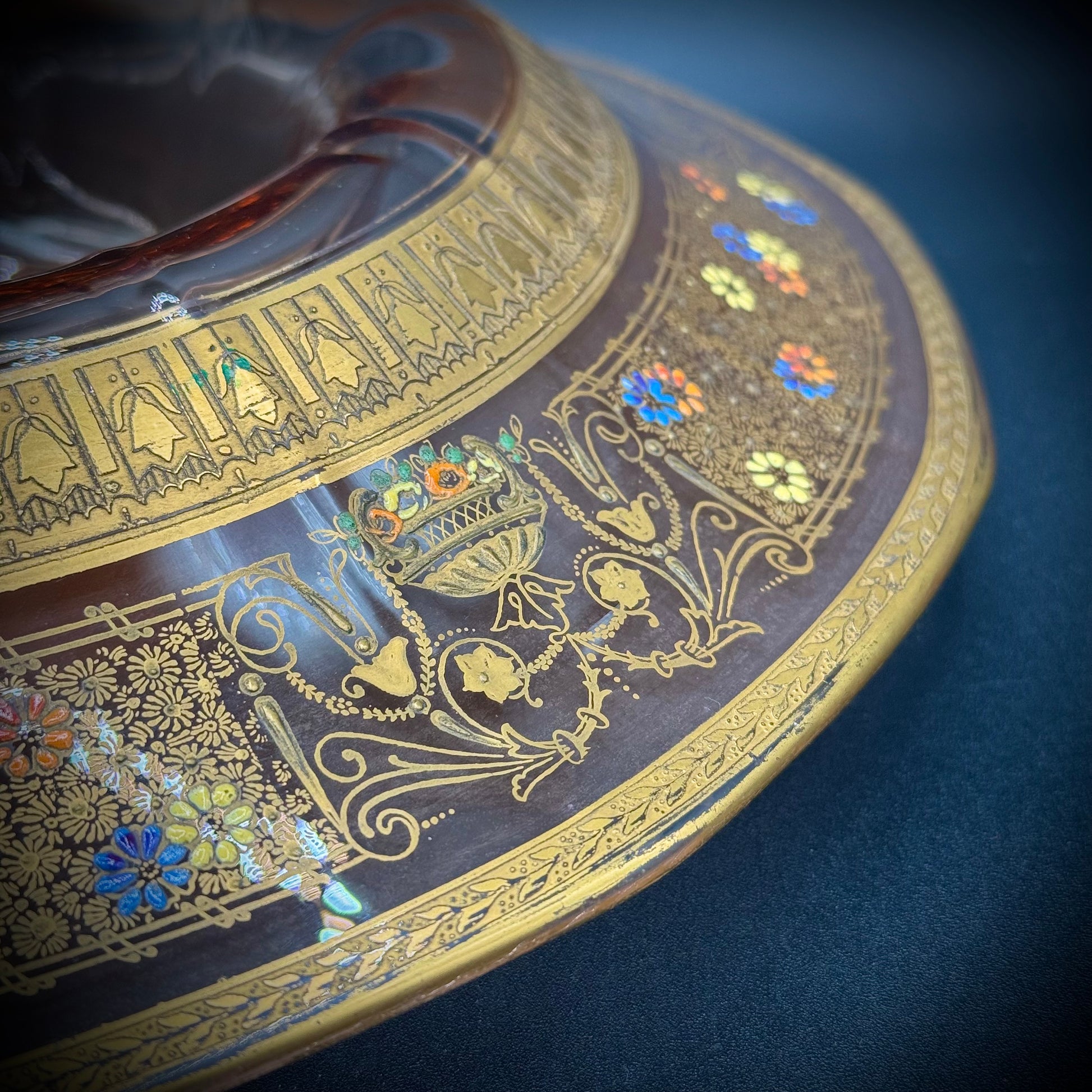 A stunning vintage set of three pieces in exquisite shape for its age. Featuring depression glass, elaborate etched 24kt gold scrollwork accents and enamel flower accents, this set includes a large presentation bowl and two matching candlesticks.