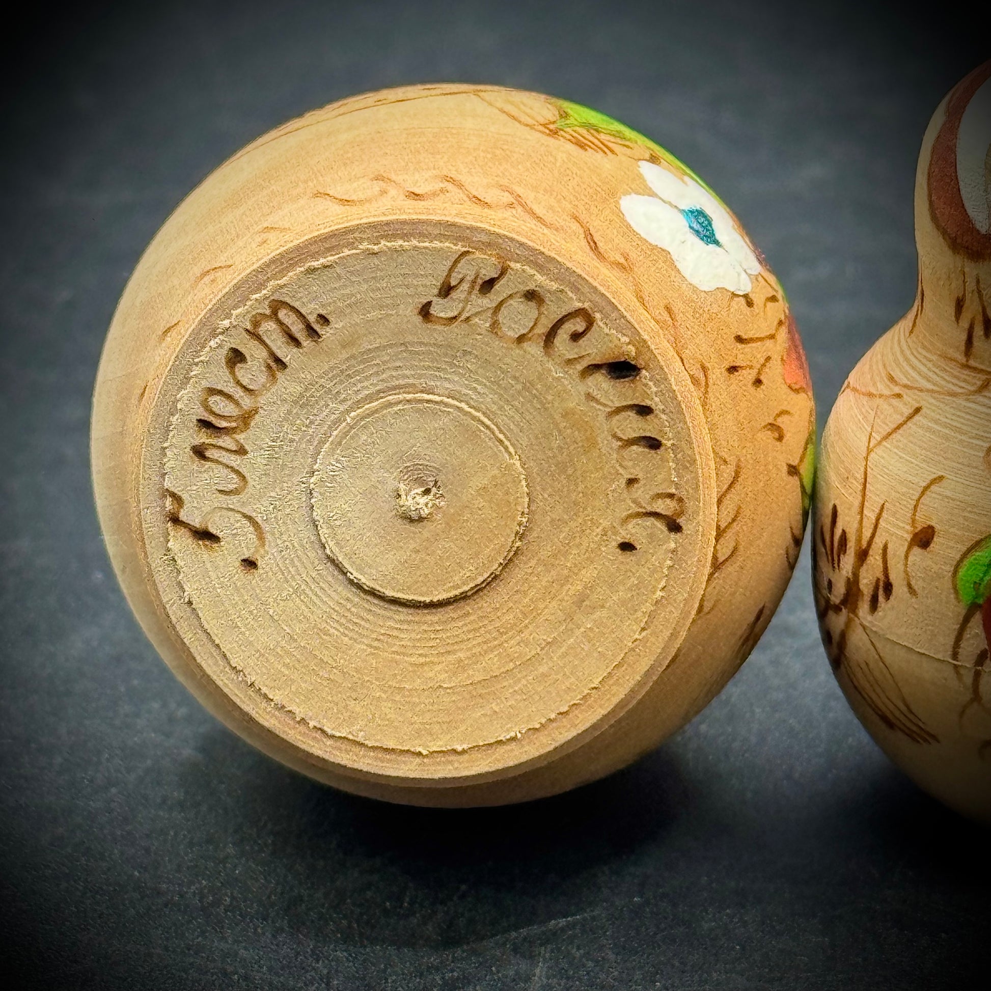 Signed in Cyrillic on the bottom of then largest piece, which measures 2.75" tall. Beautiful painting on all four levels.