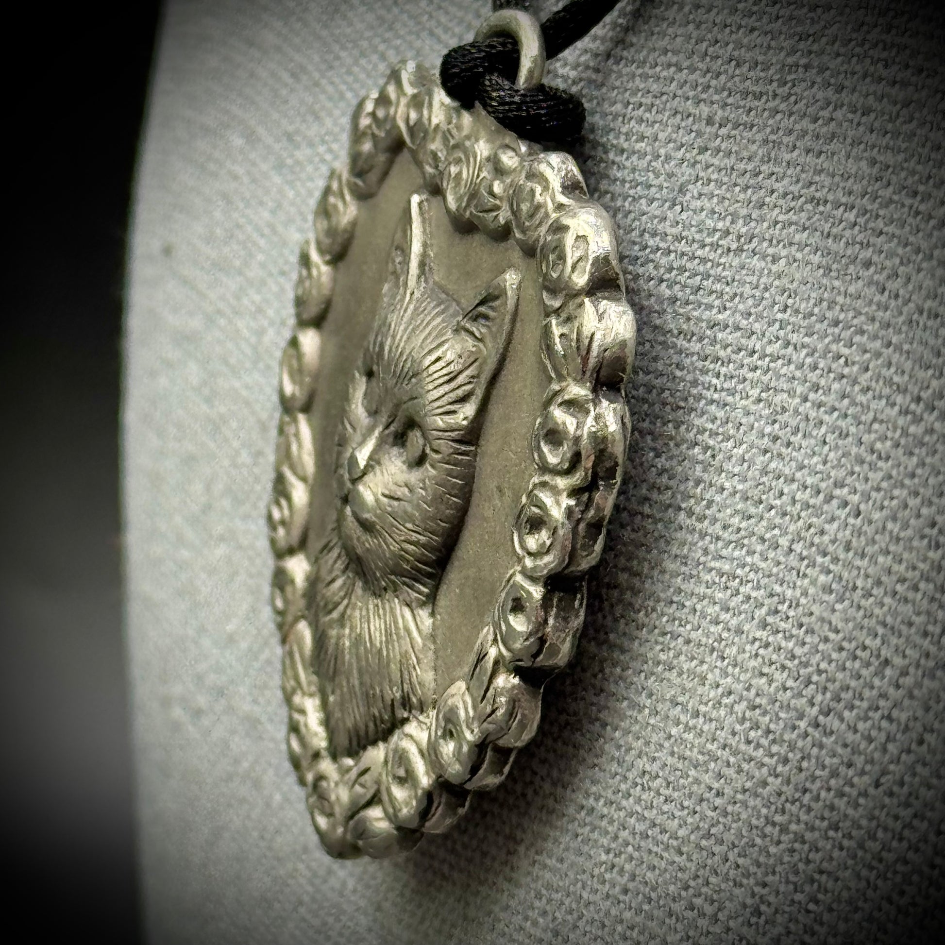 Comes on a 20" black silk rope.