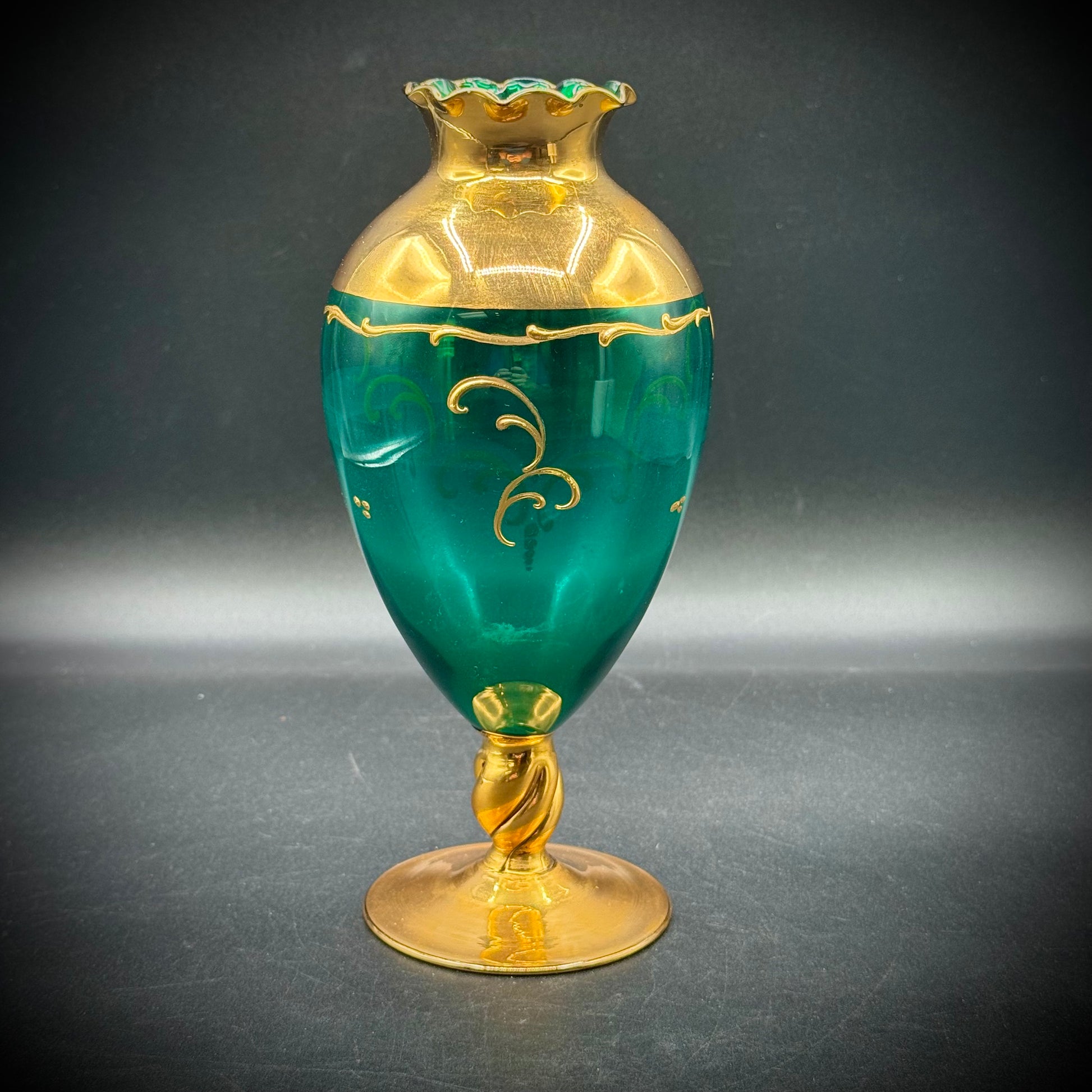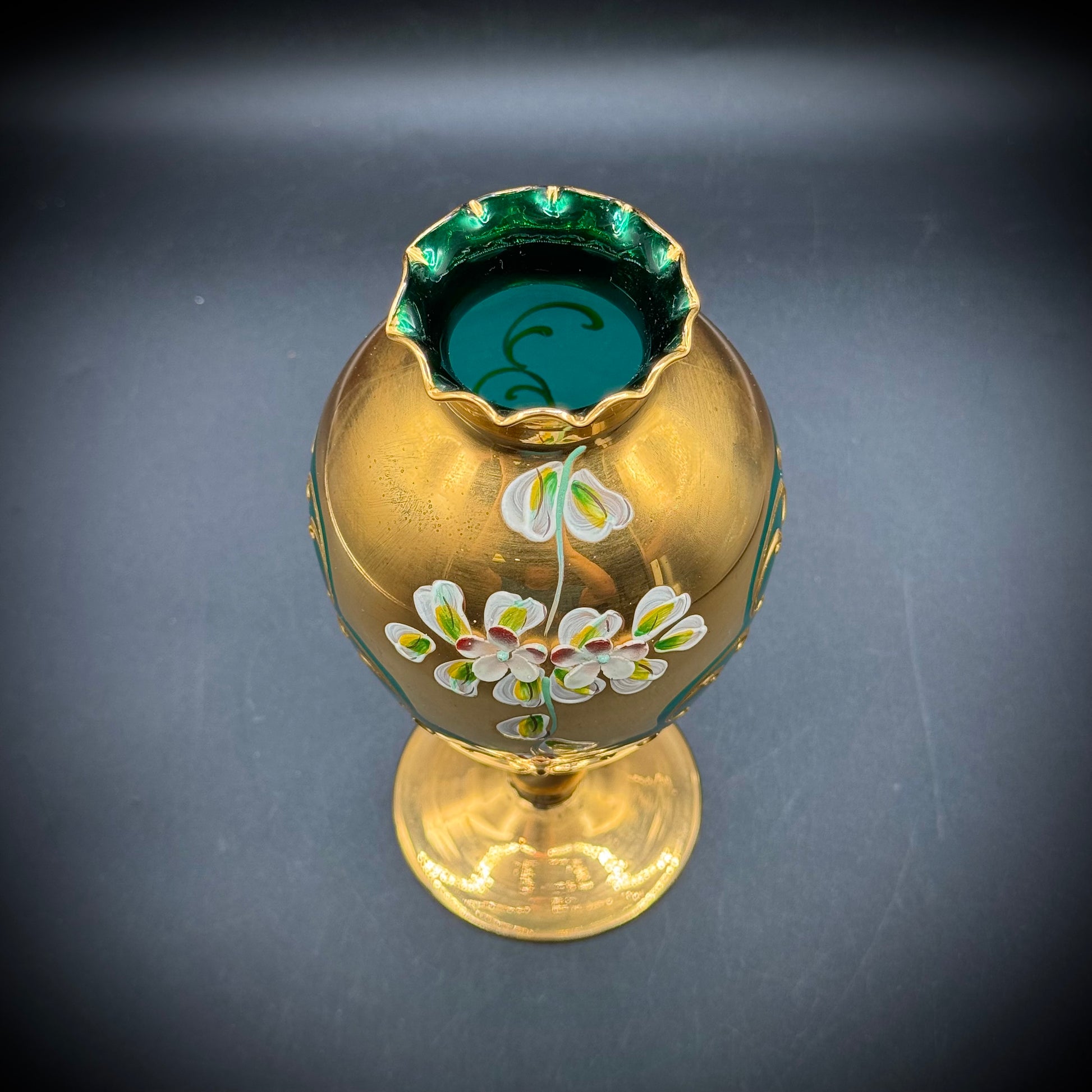 Vintage Emerald Green Murano Venetian Hand Painted Flower Vase