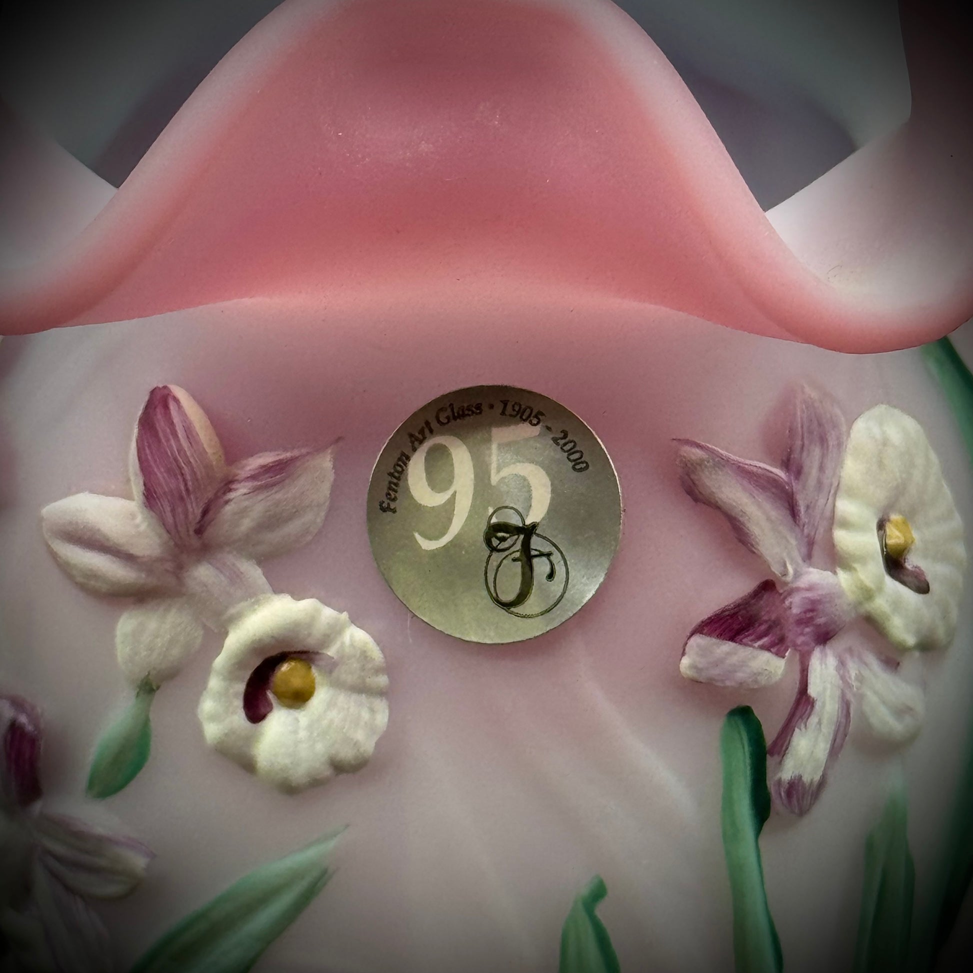 Vintage Fenton 95th Anniversary Blue Burmese Hand Painted & Sean Fenton Signed Daffodil Vase