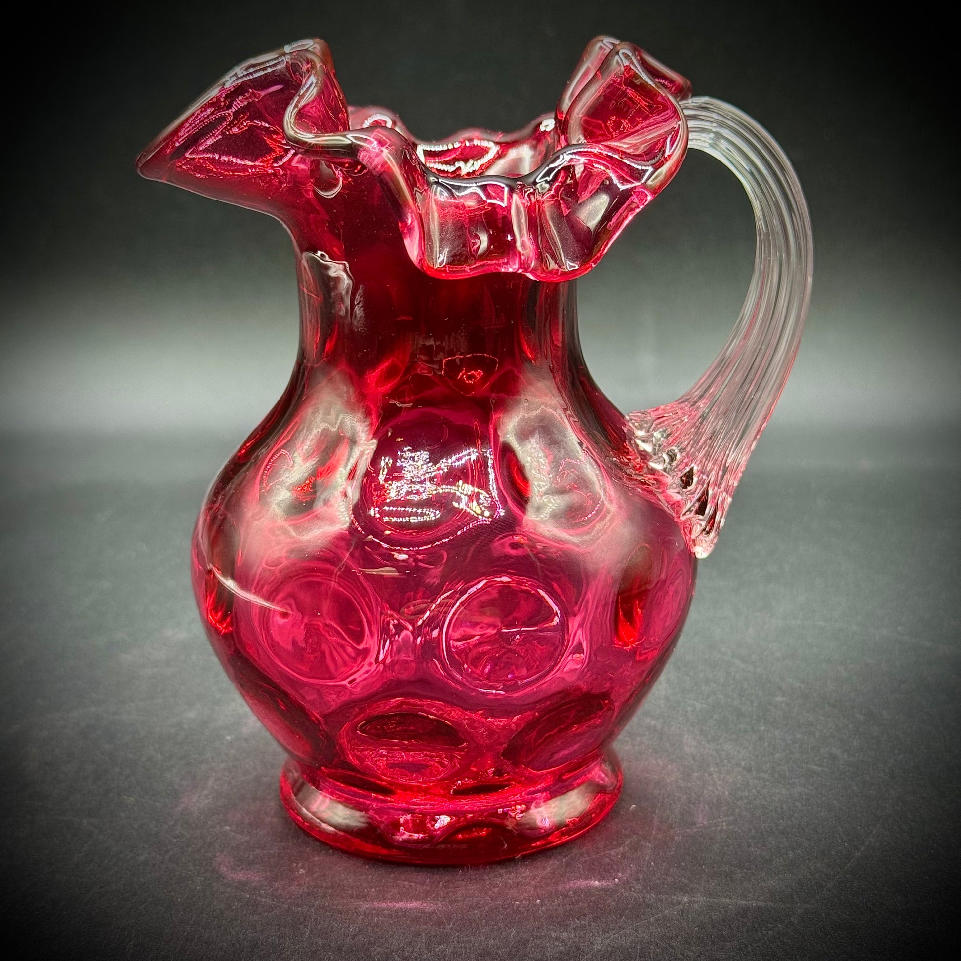 A fantastic vintage Fenton ruffle pitcher. Cranberry color and Coin Dot Pattern.