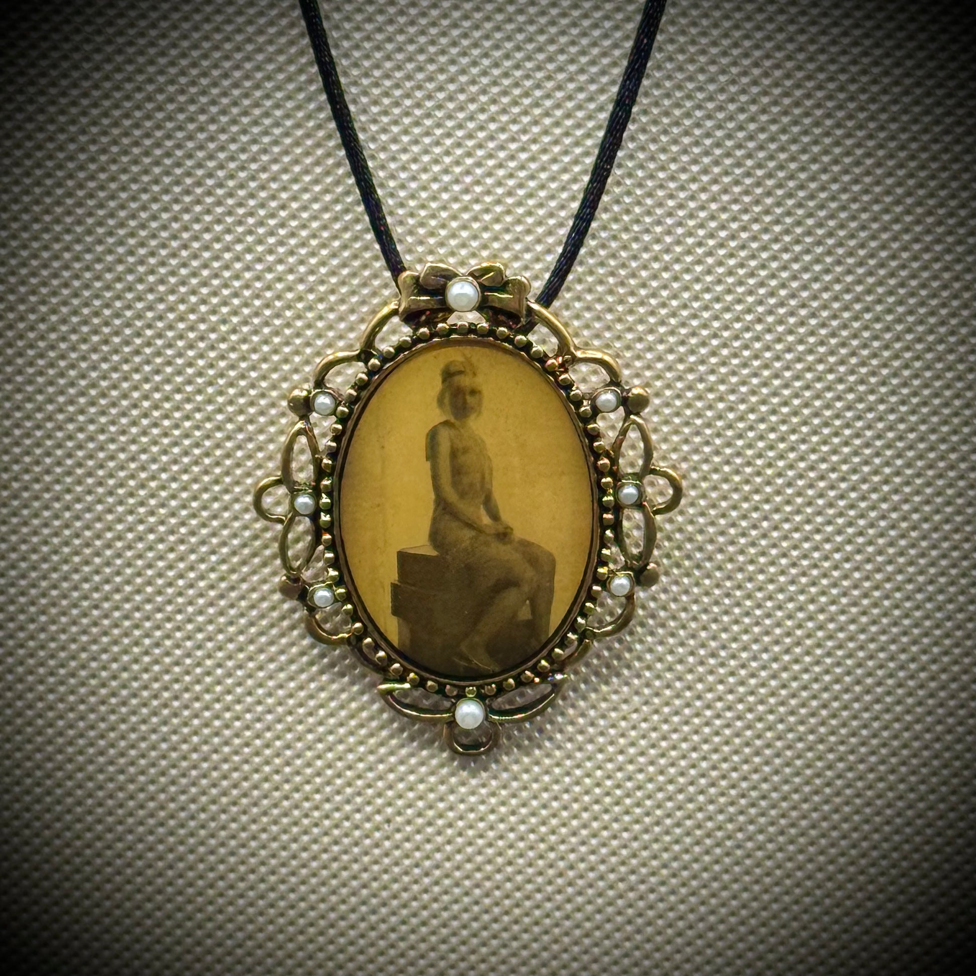 Vintage Gold Tone & Faux Pearl Pendant with Flapper Girl Photograph