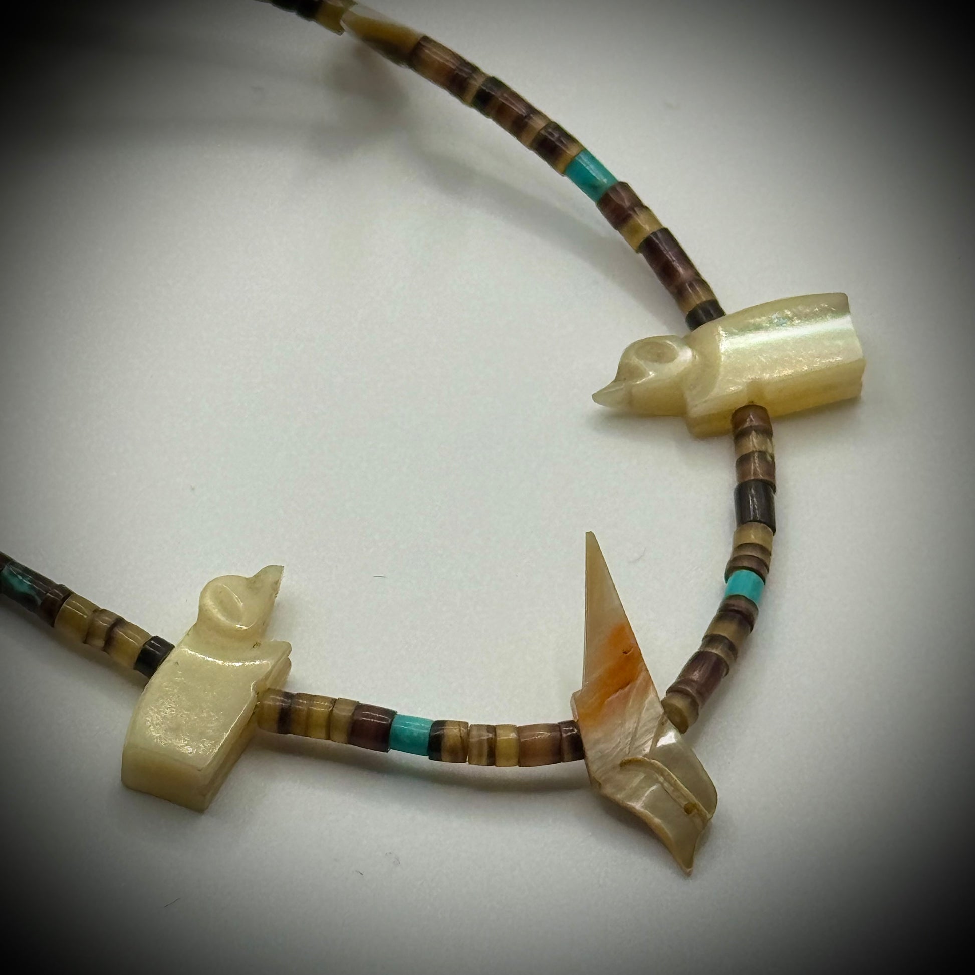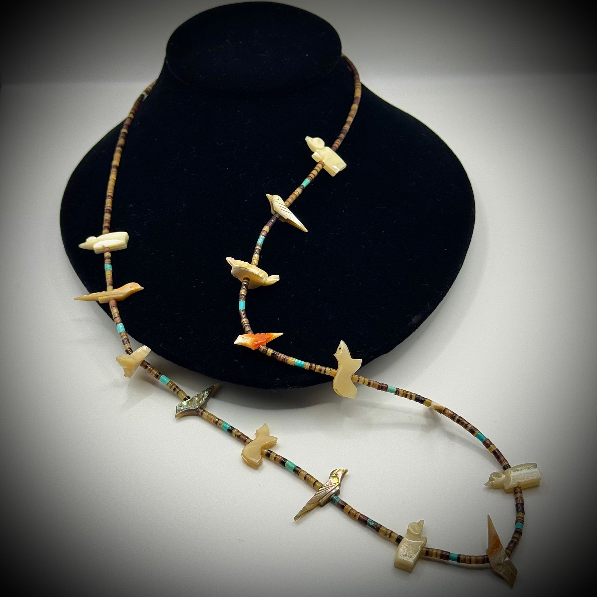 Featuring carved abalone, mother of pearl and turquoise and beads. Shepards hook clasp.