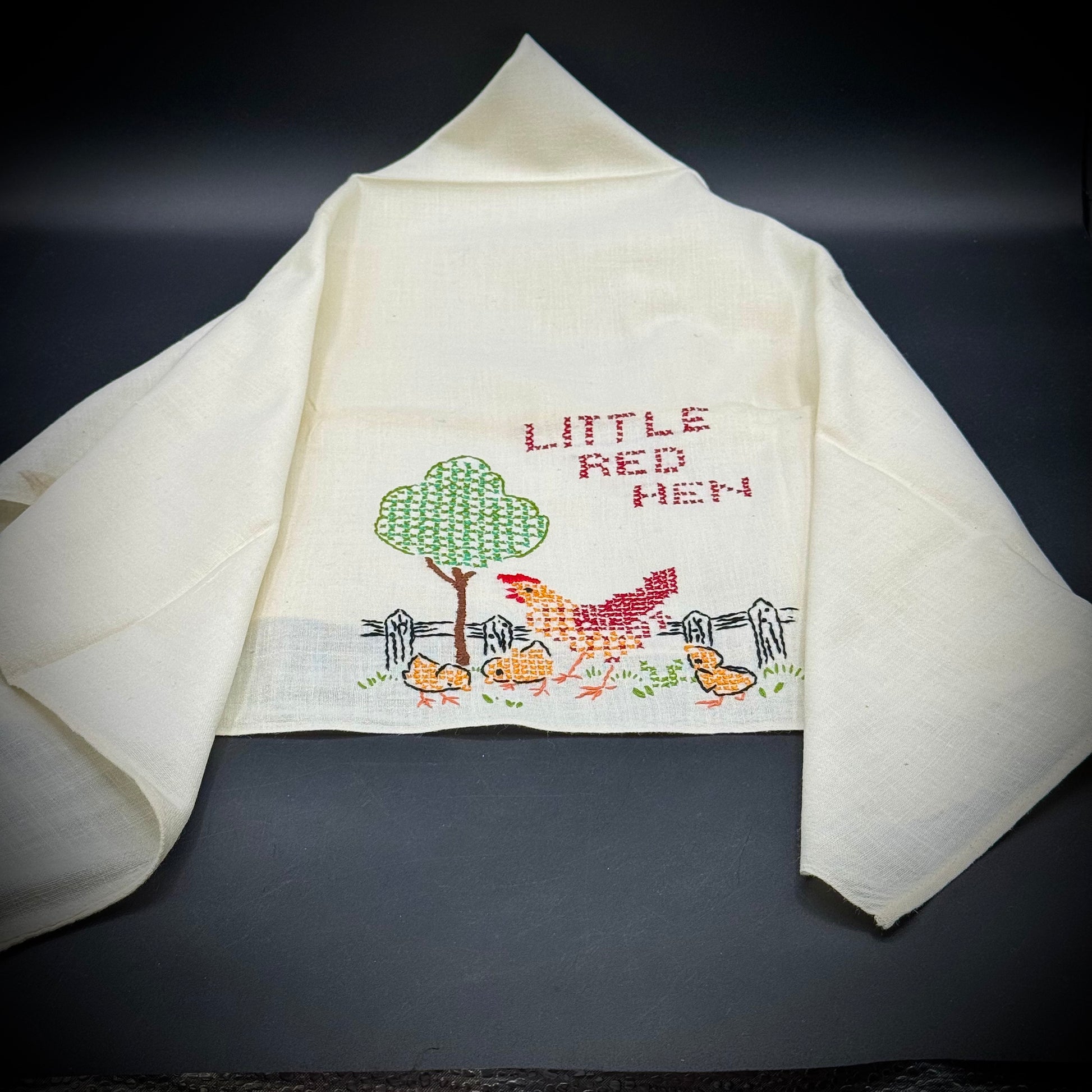 Vintage Hand Embroidered Linen "Little Red Hen" Small Table Cloth