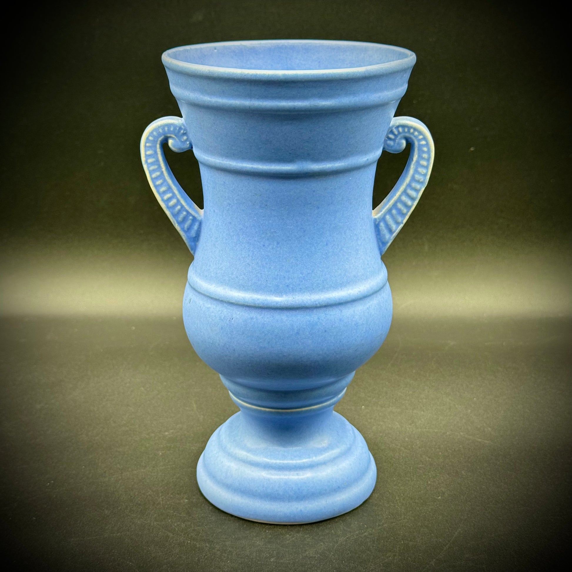 Measures 8.25" tall with beautiful periwinkle blue color and the remnants of a label on the bottom.