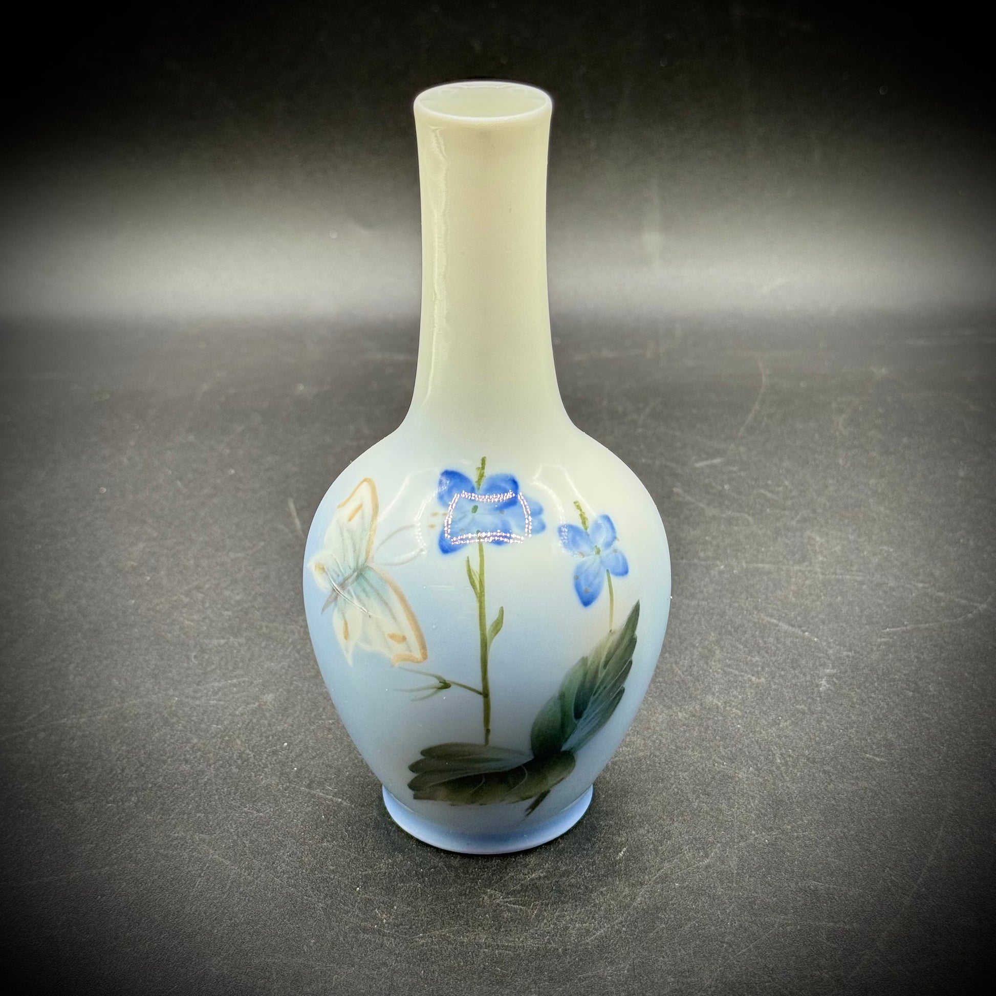 Delicate and beautiful flower and butterfly motif on this fully marked vintage Royal Copenhagen bud vase.