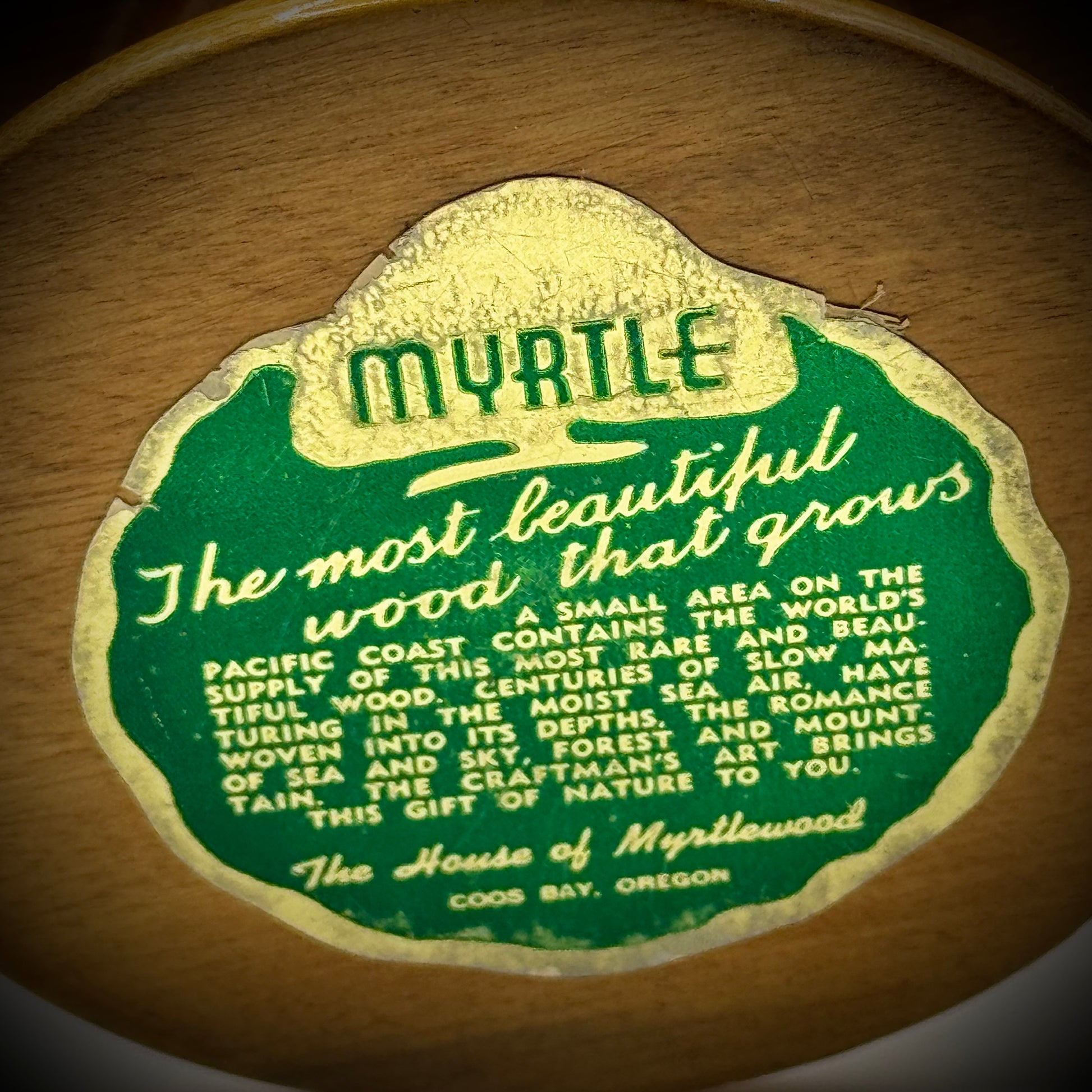 From House of Myrtlewood, Coos Bay, Oregon with the original in excellent condition on bottom.