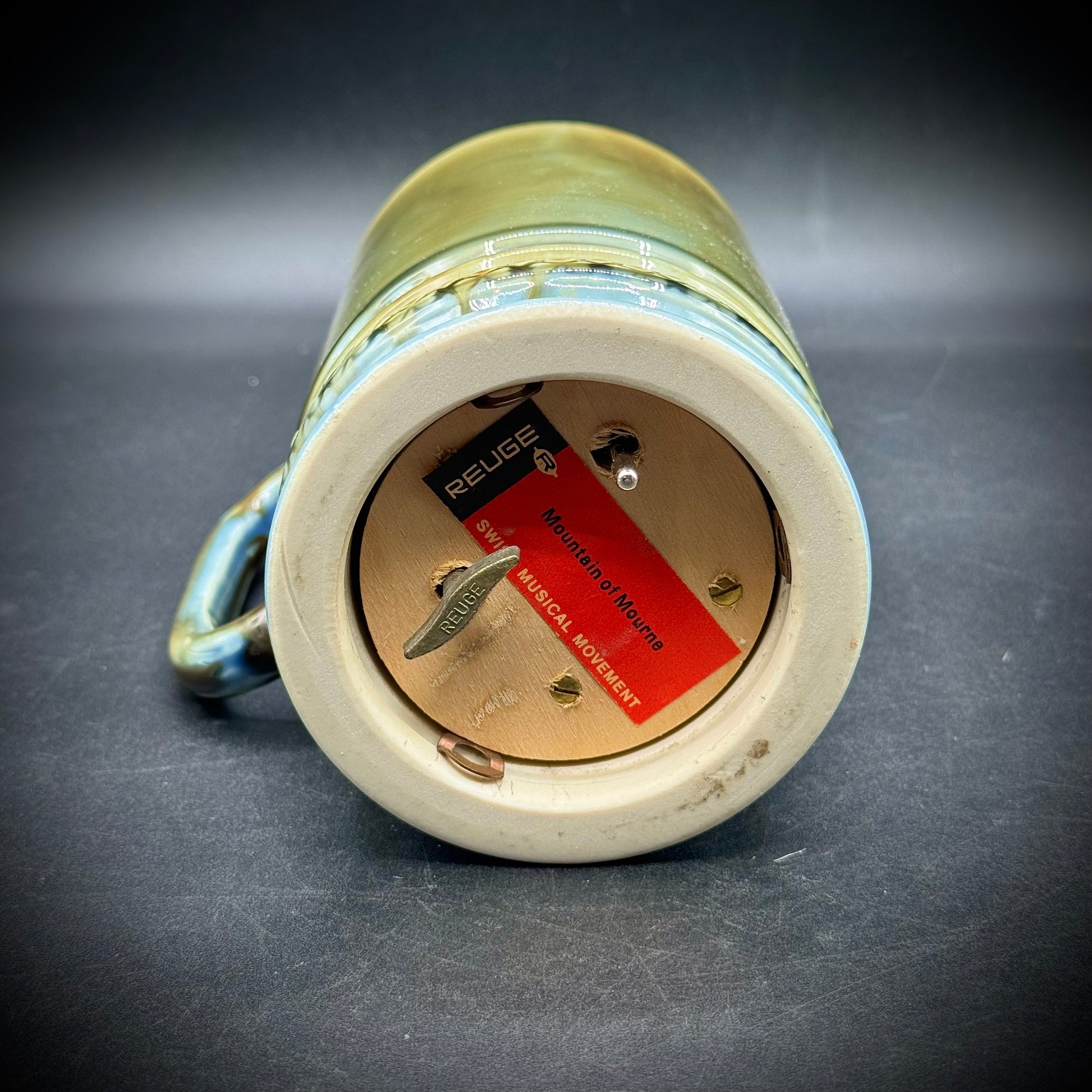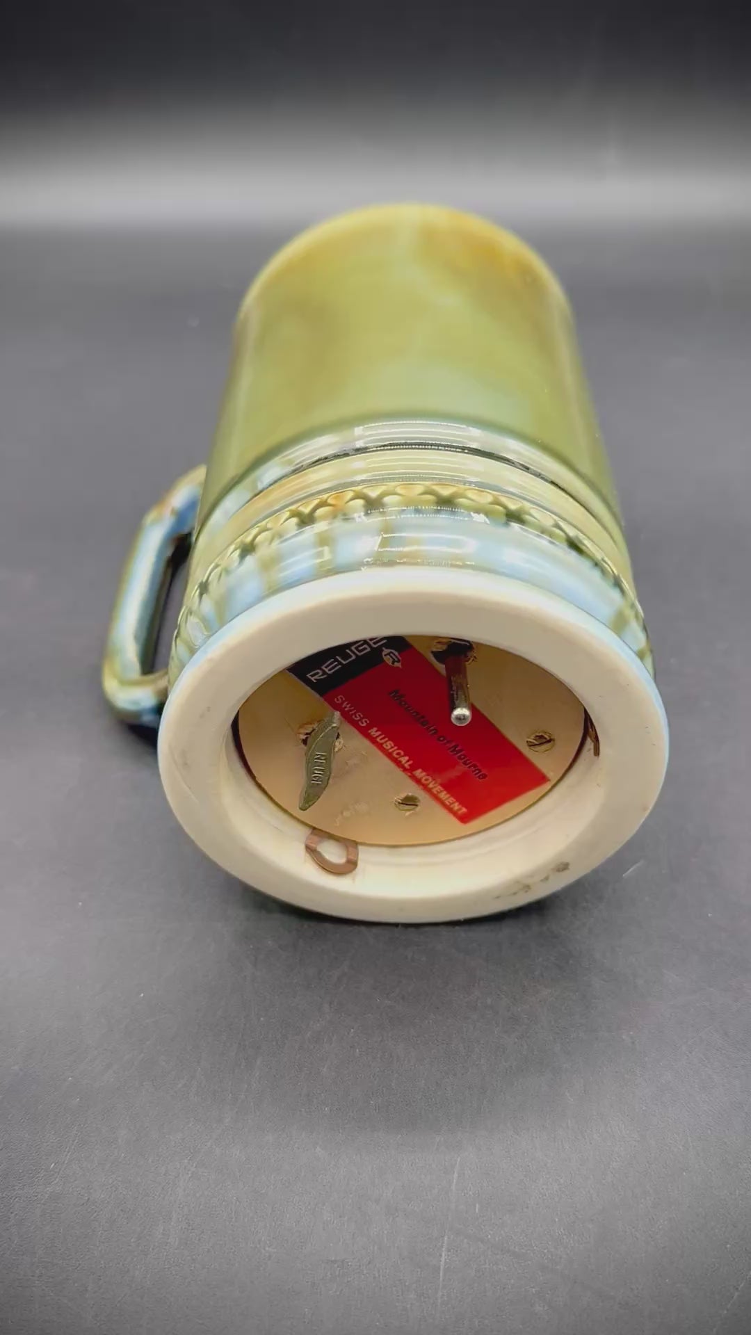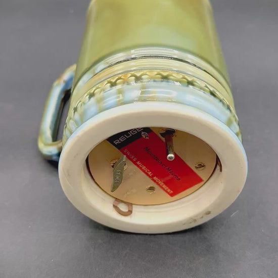 Beautiful green tone with hints of blue. Music box on then bottom made in Switzerland and plays "Mountains of Mourne" (video included to show how cleanly it plays)